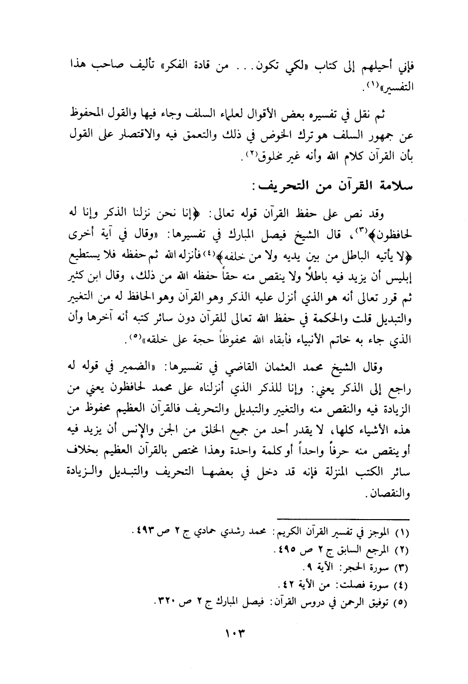 ثم نقل في تفسيره بعض الأقوال لعلماء السلف وجاء فيها: والقول المحفوظ عن جمهور السلف هو ترك الخوض في ذلك والتعمق فيه والاقتصار على القول بأن القرآن كلام الله وأنه غير مخلوق2.