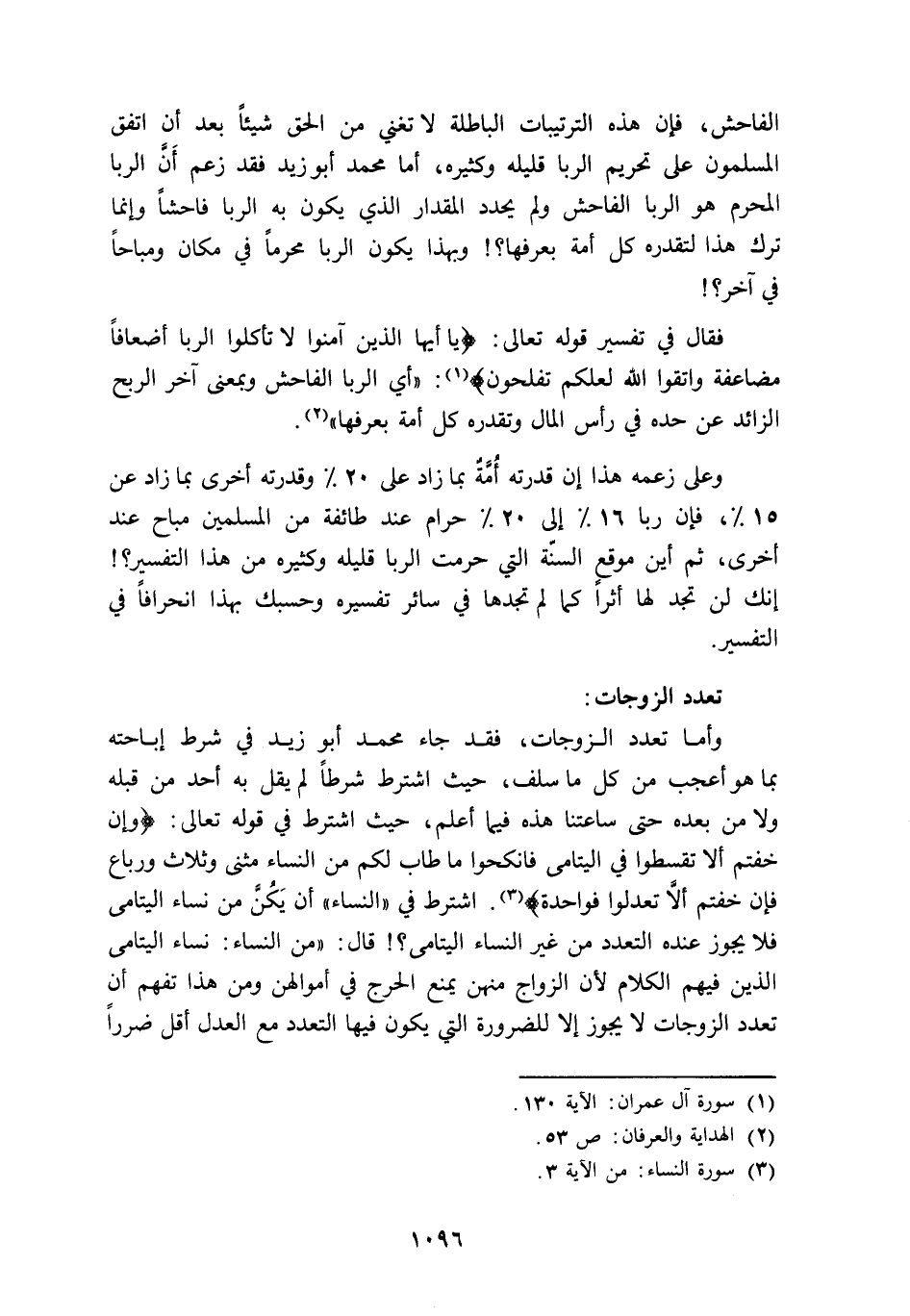 الفاحش، فإن هذه الترتيبات الباطلة لا تغني من الحق شيئا بعد أن اتفق المسلمون على تحريم الربا قليلة وكثيرة؛ أما محمد أبو زيد فقد زعم أن الربا المحرم هو الربا الفاحش ولم يحدد المقدار الذي يكون به الربا فاحشا؛ وإنما ترك هذا لتقدره كل أمة بعرفها؟! وبهذا يكون الربا محرما في مكان ومباحا في آخر؟!