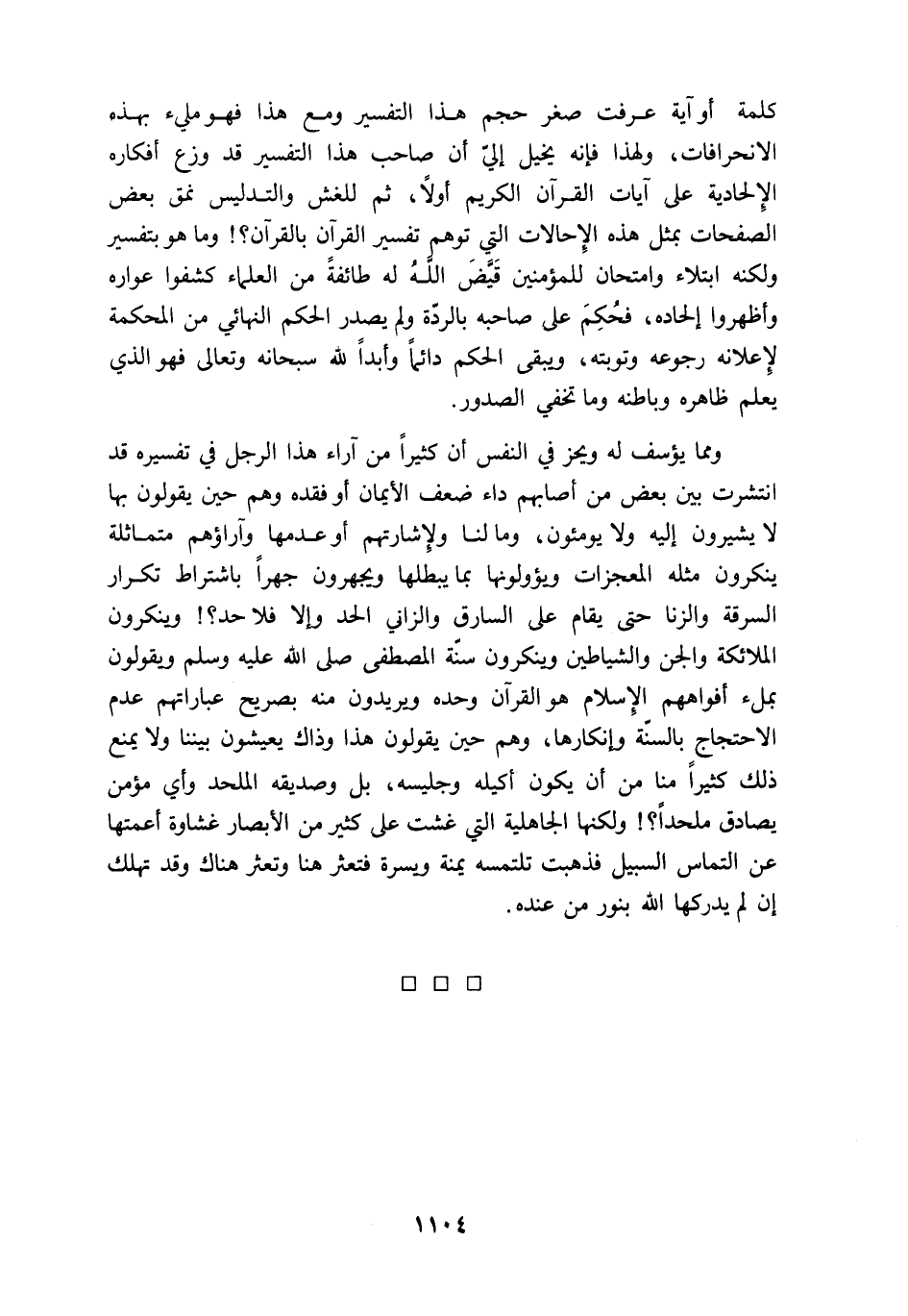 ومما يؤسف له ويحز في النفس أن كثير من آراء هذا الرجل في تفسيره قد انتشرت بين بعض من أصابهم داء ضعف الإيمان أو فقده وهم حين يقولون بها لا يشيرون إليه ولا يؤمنون، وما لنا ولإشارتهم أو عدمها وآراؤهم متماثلة ينكرون مثله المعجزات ويؤولونها بما يبطلها ويجهرون جهرا باشتراط تكرار السرقة والزنا حتى يقام على السارق والزاني الحد وإلا فلا حد؟! وينكرون الملائكة والجن والشياطين وينكرون سنة المصطفى صلى الله عليه وسلم ويقولون بملء أفواههم الإسلام هو القرآن وحده، ويريدون منه بصريح عباراتهم عدم الاحتجاج بالسنة وإنكارها، وهم حين يقولون هذا وذاك يعيشون بيننا ولا يمنع ذلك كثيرا منا من أن يكون أكيله وجليسه؛ بل وصديقه الملحد وأي مؤمن يصادق ملحدا؟! ولكنها الجاهلية التي غشت على كثير من الأبصار غشاوة أعمتها عن التماس السبيل فذهبت تلتمسه يمنة ويسرة فتعثر هنا وتعثر هناك، وقد تهلك إن لم يدركها الله بنور من عنده.