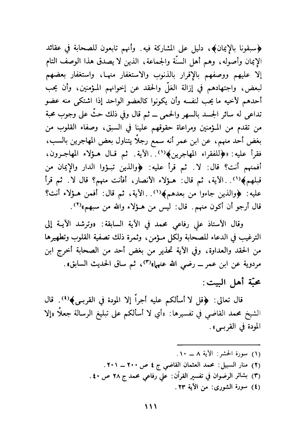 قال تعالى: {قُلْ لا أَسْأَلُكُمْ عَلَيْهِ أَجْرًا إِلَّا الْمَوَدَّةَ فِي الْقُرْبَى} 4. قال الشيخ محمد القاضي في تفسيرها: "أي: لا أسألكم على تبليغ الرسالة جعلا "إلا المودة في القربى".