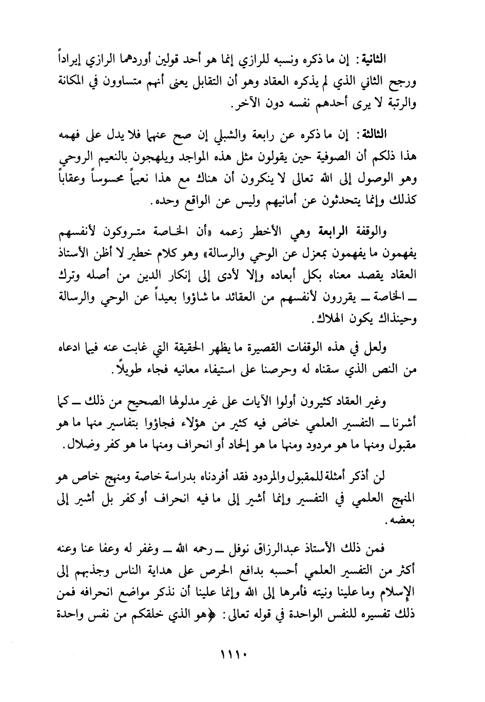 والوقفة الرابعة وهي الأخطر زعمه "أن الخاصة متروكون لأنفسهم يفهمون ما يفهمون بمعزل عن الوحي والرسالة"، وهو كلام خطير لا أظن الأستاذ العقاد يقصد ممعناه بكل أبعاده؛ وإلا لأدى إلى إنكار الدين من أصله وترك -الخاصة- يقررون لأنفسهم من العقائد ما شاؤوا بعيدا عن الوحي والرسالة وحينذاك يكون الهلاك.