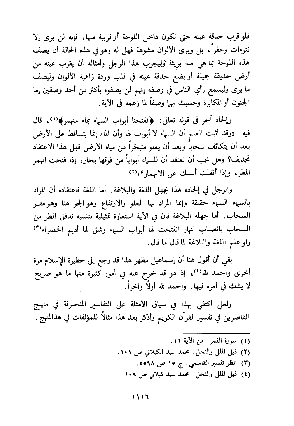 بقي أن أقول هنا أن إسماعيل مظهر هذا قد رجع إلى حظيرة الإسلام مرة أخرى والحمد لله4، إذا هو قد خرج عنه في أمور كثيرة منها ما هو صريح لا يشك في أمره فيها. والحمد لله أولا وآخرا.