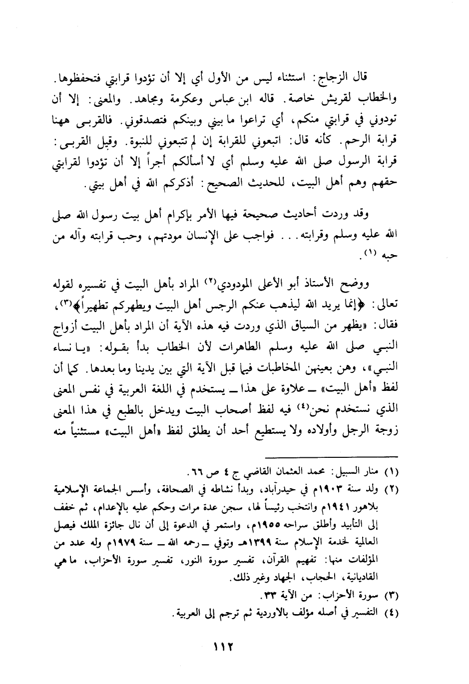 ووضح الأستاذ أبو الأعلى المودودي2 المراد بأهل البيت في تفسيره لقوله تعالى: {إِنَّمَا يُرِيدُ اللَّهُ لِيُذْهِبَ عَنْكُمُ الرِّجْسَ أَهْلَ الْبَيْتِ وَيُطَهِّرَكُمْ تَطْهِيرًا} 3، فقال: "يظهر من السياق الذي وردت فيه هذه الآية أن المراد بأهل البيت أزواج النبي صلى الله عليه وسلم الطاهرات؛ لأن الخطاب بدأ بقوله: {يَا نِسَاءَ النَّبِيِّ} ، وهن بعينهن المخاطبات فيما قبل الآية التي بين يدينا وما بعدها. كما أن لفظ "أهل البيت" -علاوة على هذا- يستخدم في اللغة العربية في نفس المعنى الذي نستخدم نحن4 فيه لفظ أصحاب البيت ويدخل بالطبع في هذا المعنى زوجة الرجل وأولاده ولا يستطيع أحد أن يطلق لفظ "أهل البيت" مستثنيا منه