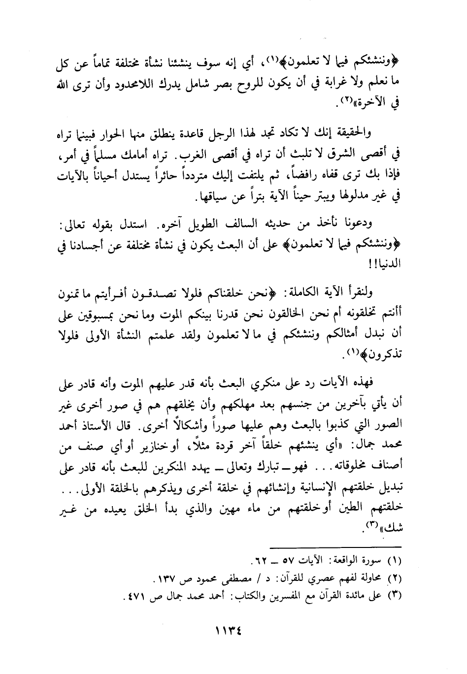{وَنُنْشِئَكُمْ فِي مَا لا تَعْلَمُونَ} 1، أي إنه سوف ينشئنا نشأة مختلفة تماما عن كل ما نعلم ولا غرابة في أن يكون للروح بصر شامل يدرك اللامحدود وأن ترى الله في الآخرة"2.