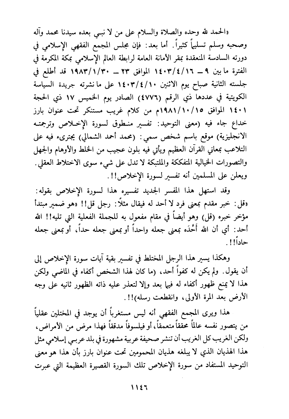 أما بعد: فإن مجلس المجمع الفقهي الإسلامي في دورته السادسة المنعقدة بمقر الأمانة العامة لرابطة العالم الإسلامي بمكة المكرمة في الفترة ما بين 9-16/ 4/ 1403هـ الموافق 23- 30/ 1/ 1983م قد أطلع في جلسته الثانية صباح يوم الاثنين 10/ 4/ 1403 على ما نشرته جريدته السياسية الكويتية في عددها ذي الرقم "4776" الصادر يوم الخميس 17 ذي الحجة 1401 الموافق 15/ 10/ 1981م من كلام غريب مستنكر تحت عنوان بارز خداع جاء فيه "معنى التوحيد: تفسير منطوق لسورة الإخلاص وترجمته الانجليزية" موقع باسم شخص سمي: "محمد أحمد الشمالي" يجترئ فيه على التلاعب بمعاني القرآن العظيم، ويأتي فيه بلون عجيب من الخلط والأوهام والجهل والتصورات الخيالية المتفككة والملتبكة لا تدل على شيء سوى الاختلاط العقلي.