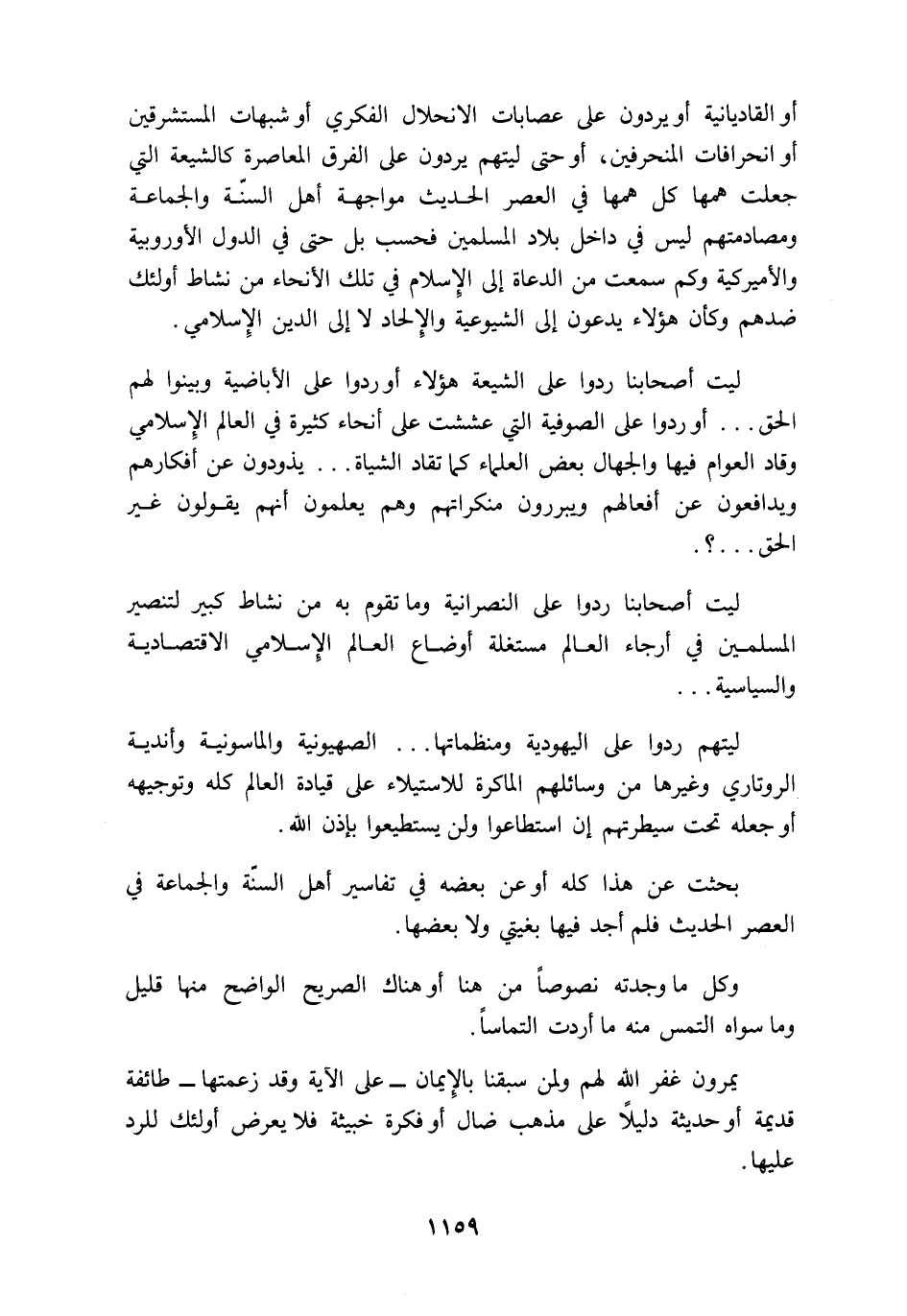 ليت أصحابنا ردوا على الشيعة هؤلاء أو ردوا على الإباضية وبينوا لهم الحق، أو ردوا على الصوفية التي عششت على أنحاء كثيرة في العالم الإسلامي وقاد العوام فيها والجهال بعض العلماء كما تقاد الشياة يذودون عن أفكارهم ويدافعون عن أفعالهم ويبررون منكراتهم وهم يعلمون أنهم يقولون غير الحق؟