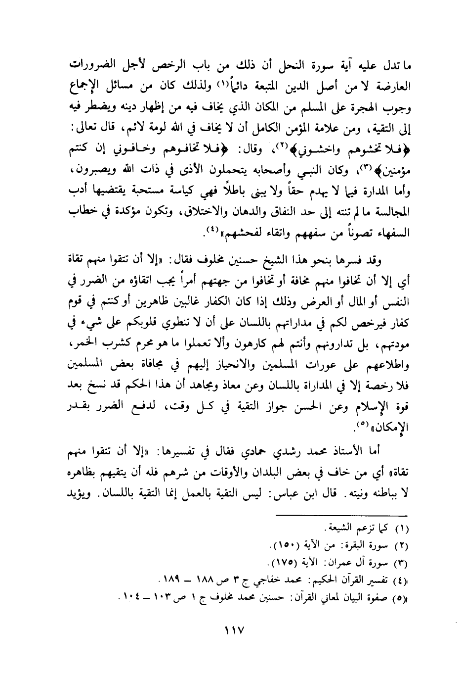 وقد فسرها بنحو هذا الشيخ حسنين مخلوف فقال: "إلا أن تتقوا منهم تقاة أي: إلا أن تخافوا منهم مخافة أو تخافوا من جهتهم أمرا يجب اتقاؤه من الضرر في النفس أو المال أو العرض, وذلك إذا كان الكفار غالبين ظاهرين أو كنتم في قوم كفار فيرخص لكم في مداراتهم باللسان على أن لا تنطوي قلوبكم على شيء في مودتهم، بل تدارونهم وأنتم لهم كارهون وألا تعملوا ما هو محرم كشرب الخبر، واطلاعهم على عورات المسلمين والانحياز إليهم في مجافاة بعض المسلمين فلا رخصة إلا في المداراة باللسان, وعن معاذ ومجاهد أن هذا الحكم قد نسخ بعد قوة الإسلام, وعن الحسن جواز التقية في كل وقت؛ لدفع الضرر بقدر الإمكان"5.