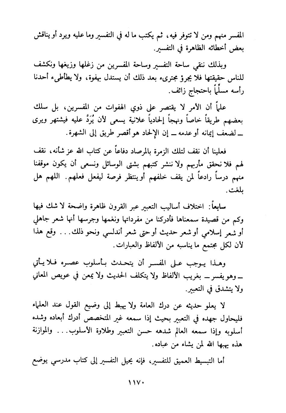 وهذا يوجب على المفسر أن يتحدث بأسلوب عصره فلا يأتي -وهو يفسر- بغريب الألفاظ ولا يتكلف الحديث ولا يمعن في عويص المعاني ولا يتشدق في التعبير.