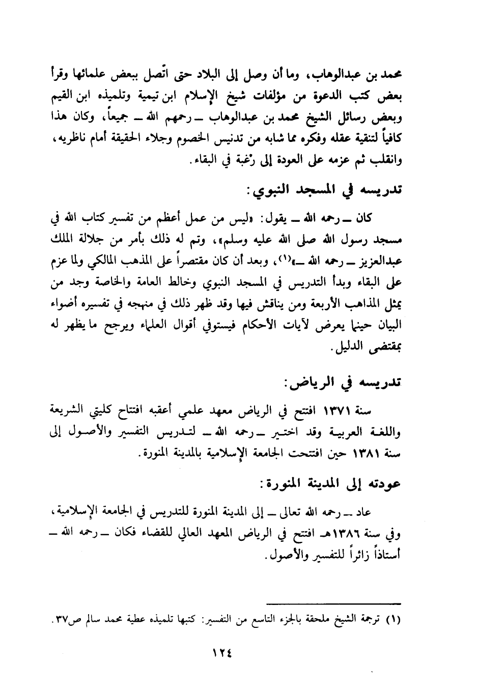 عاد -رحمه الله تعالى- إلى المدينة المنورة للتدريس في الجامعة الإسلامية, وفي سنة 1386هـ افتتح في الرياض المعهد العالي للقضاء, فكان -رحمه الله- أستاذا زائرا للتفسير والأصول.