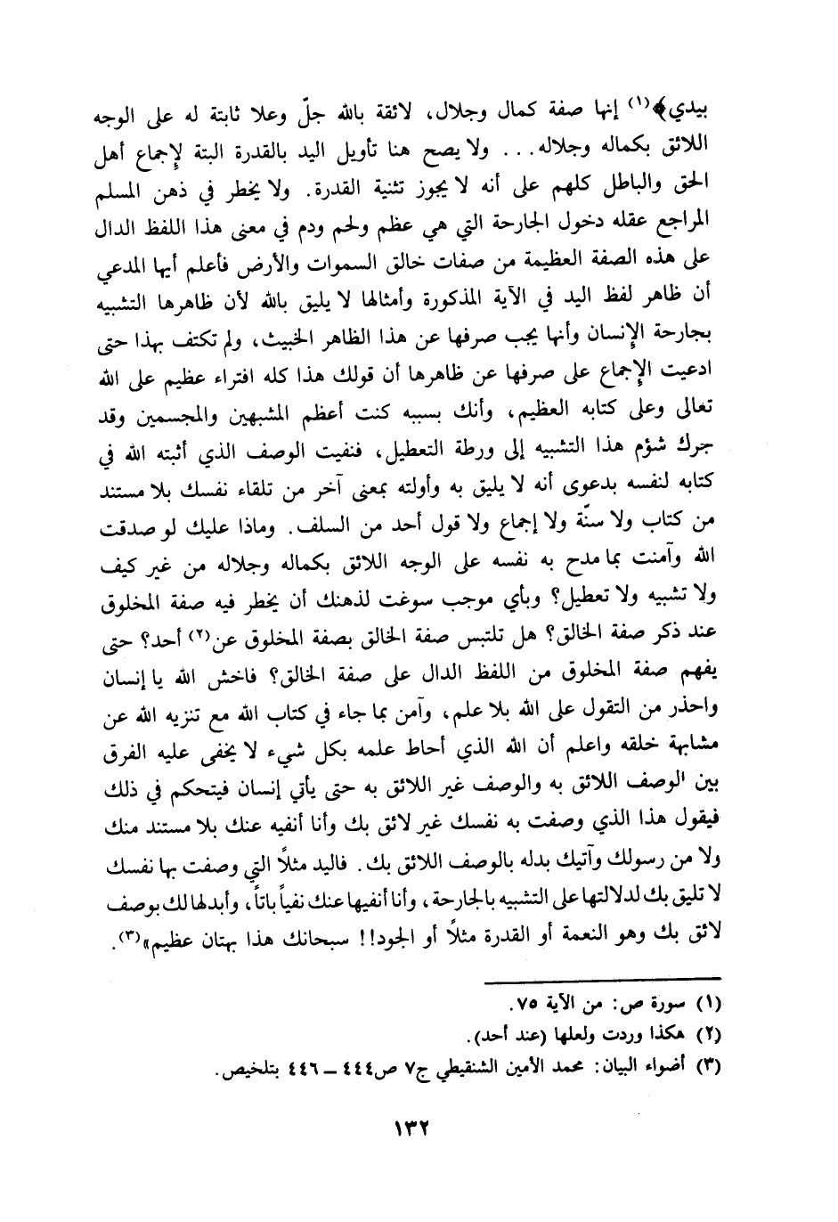 بِيَدَيَّ} 1 أنها صفة كمال وجلال، لائقة بالله جل وعلا ثابتة له على الوجه اللائق بكماله وجلاله ... ولا يصح هنا تأويل اليد بالقدرة البتة لإجماع أهل الحق والباطل كلهم على أنه لا يجوز تثنية القدرة. ولا يخطر في ذهن المسلم المراجع عقله دخول الجارحة التي هي عظم ولحم ودم في معنى هذا اللفظ الدال على هذه الصفة العظيمة من صفات خالق السموات والأرض, فاعلم أيها المدعي أن ظاهر لفظ اليد في الآية المذكورة وأمثالها لا يليق بالله؛ لأن ظاهرها التشبيه بجارحة الإنسان وأنها يجب صرفها عن هذا الظاهر الخبيث، ولم تكتف بهذا حتى ادعيت الإجماع على صرفها عن ظاهرها أن قولك هذا كله افتراء عظيم على الله تعالى وعلى كتابه العظيم، وأنك بسببه كنت أعظم المشبهين والمجسمين وقد جرك شؤم هذا التشبيه إلى ورطة التعطيل، فنفيت الوصف الذي أثبته الله في كتابه لنفسه بدعوى أنه لا يليق به وأولته بمعنى آخر من تلقاء نفسك بلا مستند من كتاب ولا سنة ولا إجماع ولا قول أحد من السلف. وماذا عليك لو صدقت الله وآمنت بما مدح به نفسه على الوجه اللائق بكماله وجلاله من غير كيف ولا تشبيه ولا تعطيل؟ وبأي موجب سوغت لذهنك أن يخطر فيه صفة المخلوق عند ذكر صفة الخالق؟ هل تلتبس صفة الخالق بصفة المخلوق عن2 أحد, حتى يفهم صفة المخلوق من اللفظ الدال على صفة الخالق؟ فاخشَ الله يا إنسان واحذر من التقول على الله بلا علم، وآمن بما جاء في كتاب الله مع تنزيه الله عن مشابهة خلقه, واعلم أن الله الذي أحاط علمه بكل شيء لا يخفى عليه الفرق بين الوصف اللائق به والوصف غير اللائق به حتى يأتي إنسان فيتحكم في ذلك فيقول: هذا الذي وصفت به نفسك غير لائق بك وأنا أنفيه عنك بلا مستند منك ولا من رسولك وآتيك بدله بالوصف اللائق بك. فاليد مثلا التي وصفت بها نفسك لا تليق بك لدلالتها على التشبيه بالجارحة، وأنا أنفيها عنك نفيا باتا، وأبدلها لك بوصف لائق بك وهو النعمة أو القدرة مثلا أو الجود!! سبحانك هذا بهتان عظيم3.