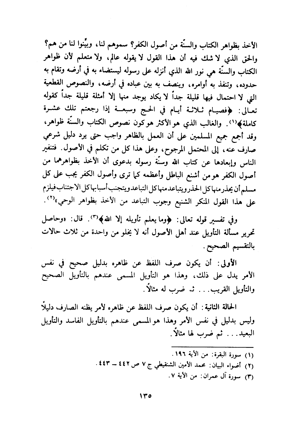 وفي تفسير قوله تعالى: {وَمَا يَعْلَمُ تَأْوِيلَهُ إِلَّا اللَّهُ} 3, قال: "وحاصل تحرير مسألة التأويل عند أهل الأصول أنه لا يخلو من واحدة من ثلاث حالات بالتقسيم الصحيح: