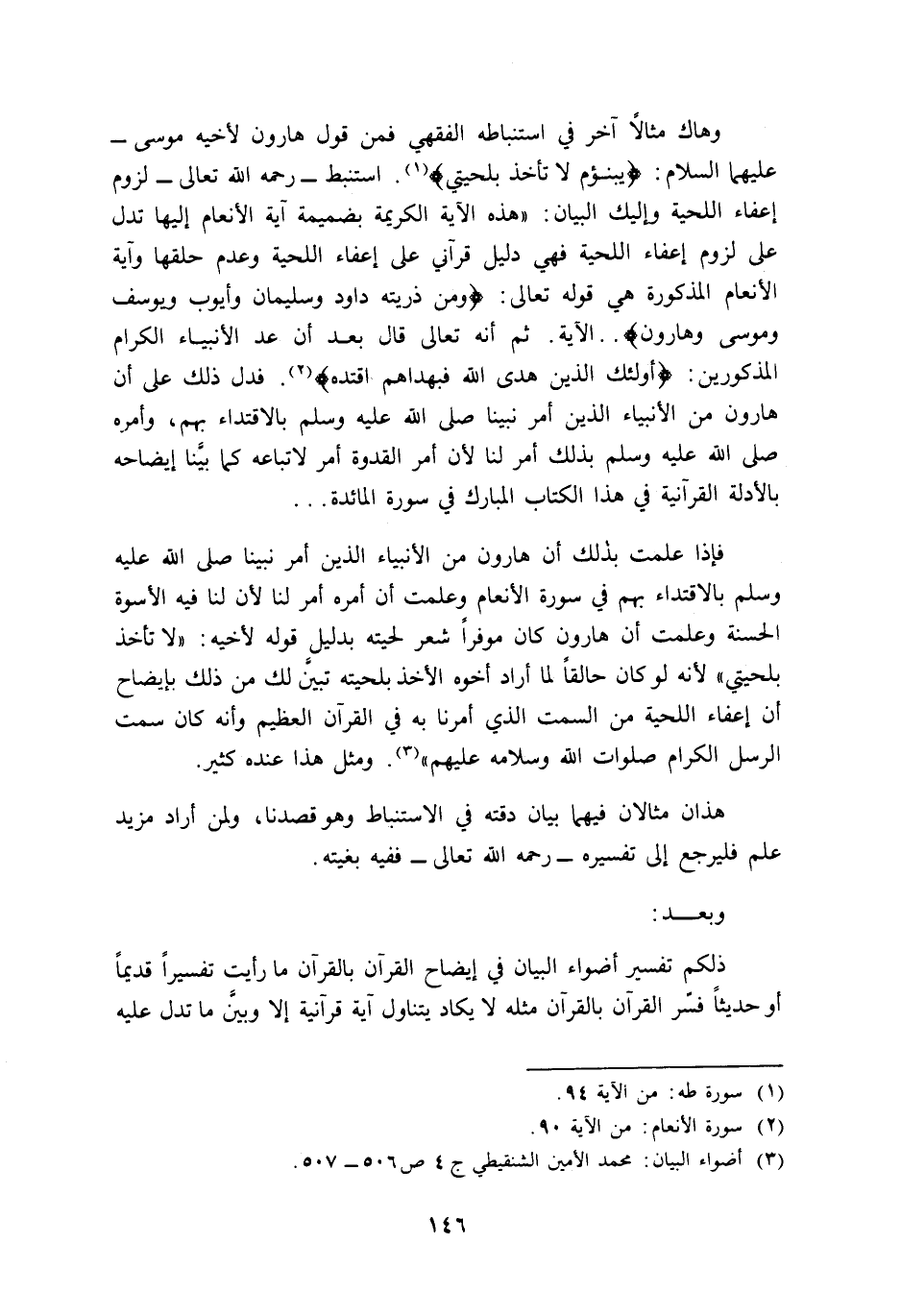 فإذا علمت بذلك أن هارون من الأنبياء الذين أمر نبينا -صلى الله عليه وسلم- بالاقتداء بهم في سورة الأنعام وعلمت أن أمره أمر لنا؛ لأن لنا فيه الأسوة الحسنة وعلمت أن هارون كان موفرا شعر لحيته بدليل قوله لأخيه: {لا تَأْخُذْ بِلِحْيَتِي} لأنه لو كان حالقا لما أراد أخوه الأخذ بلحيته تبين لك من ذلك بإيضاح أن إعفاء اللحية من السمت الذي أمرنا به في القرآن العظيم, وأنه كان سمت الرسل الكرام صلوات الله وسلامه عليهم"3. ومثل هذا عنده كثير.