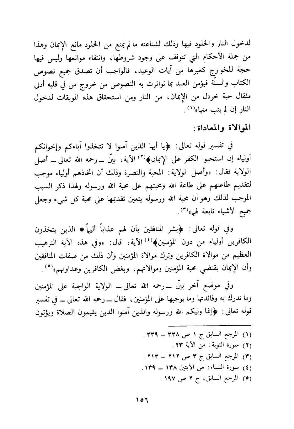 وفي قوله تعالى: {بَشِّرِ الْمُنَافِقِينَ بِأَنَّ لَهُمْ عَذَابًا أَلِيمًا، الَّذِينَ يَتَّخِذُونَ الْكَافِرِينَ أَوْلِيَاءَ مِنْ دُونِ الْمُؤْمِنِينَ} 4 الآية، قال: "وفي هذه الآية الترهيب العظيم من موالاة الكافرين وترك موالاة المؤمنين, وأن ذلك من صفات المنافقين وأن الإيمان يقتضي محبة المؤمنين وموالاتهم، وبغض الكافرين وعداوتهم"5.