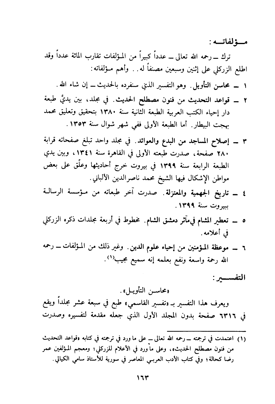 1 اعتمدت في ترجمته -رحمه الله تعالى- على ما ورد في ترجمته في كتابه: "قواعد التحديث من فنون مصطلح الحديث"، وعلى ما ورد في الأعلام للزركلي؛ ومعجم المؤلفين لعمر رضا كحالة؛ وفي كتاب الأدب العربي المعاصر في سورية للأستاذ سامي الكيالي.