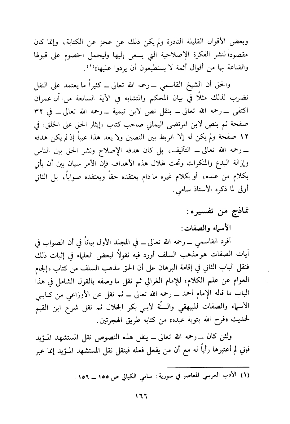 والحق أن الشيخ القاسمي -رحمه الله تعالى- كثيرا ما يعتمد على النقل, نضرب لذلك مثلا في بيان المحكم والمتشابه في الآية السابعة من آل عمران, اكتفى -رحمه الله تعالى- بنقل نص لابن تيمية -رحمه الله تعالى- في 32 صفحة ثم بنص لابن المرتضى اليماني صاحب كتاب: "إيثار الحق على الخلق" في 12 صفحة ولم يكن له إلا الربط بين النصين, ولا يعد هذا عيبا إذ لم يكن هدفه -رحمه الله تعالى- التأليف، بل كان هدفه الإصلاح ونشر الحق بين الناس وإزالة البدع والمنكرات, وتحت ظلال هذه الأهداف فإن الأمر سيان بين أن يأتي بكلام من عنده، أو بكلام غيره ما دام يعتقده حقا ويعتقده صوابا، بل الثاني أولى لما ذكره الأستاذ سامي.