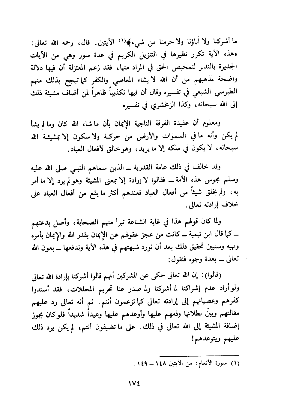 مَا أَشْرَكْنَا وَلا آبَاؤُنَا وَلا حَرَّمْنَا مِنْ شَيْءٍ} 1 الآيتين, قال رحمه الله تعالى: "هذه الآية تكرر نظيرها في التنزيل الكريم في عدة سور وهي من الآيات الجديرة بالتدبر لتمحيص الحق في المراد منها، فقد زعم المعتزلة أن فيها دلالة واضحة لمذهبهم من أن الله لا يشاء المعاصي والكفر كما تبجح بذلك منهم الطبرسي الشيعي في تفسيره وقال: إن فيها تكذيبا ظاهرا لمن أضاف مشيئة ذلك إلى الله سبحانه، وكذا الزمخشري في تفسيره.