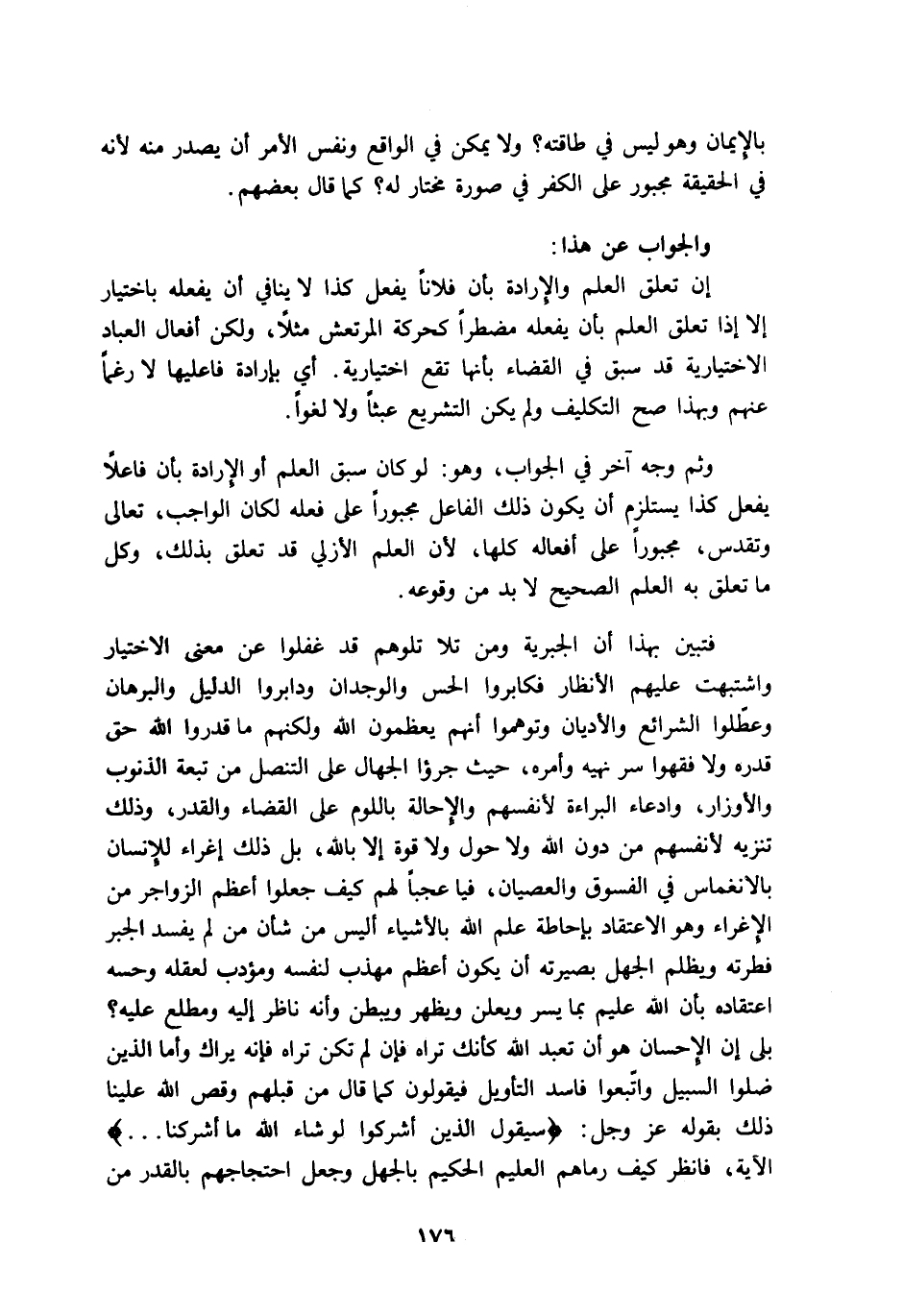 إن تعلق العلم والإرادة بأن فلانا يفعل كذا لا ينافي أن يفعله باختيار إلا إذا تعلق العلم بأن يفعله مضطرا كحركة المرتعش مثلا، ولكن أفعال العباد الاختيارية قد سبق في القضاء بأنها تقع اختيارية, أي: بإرادة فاعليها لا رغما عنهم, وبهذا صح التكليف ولم يكن التشريع عبثا ولا لغوا.