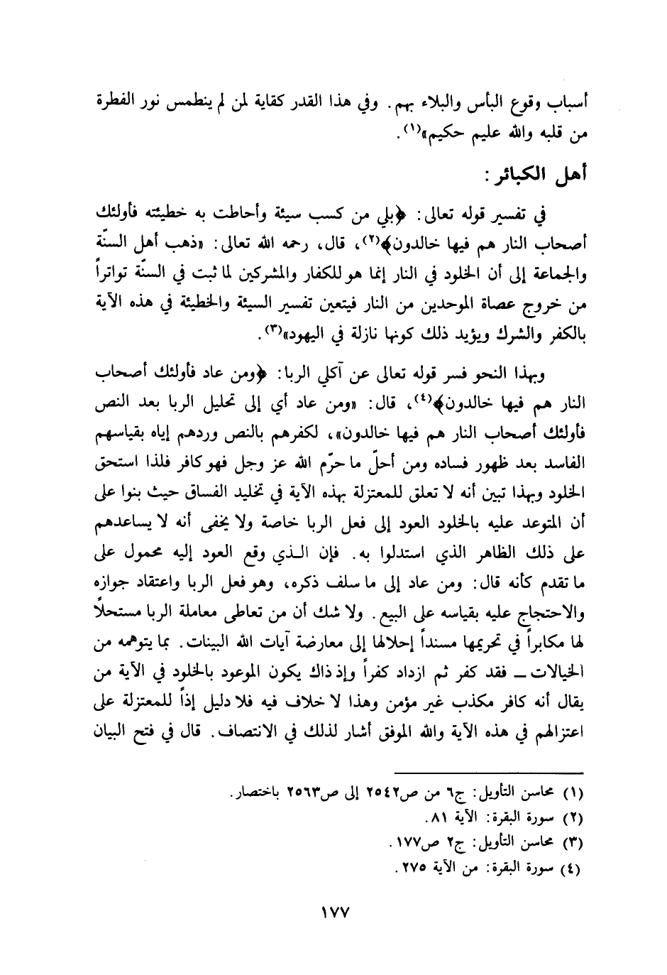 في تفسير قوله تعالى: {بَلَى مَنْ كَسَبَ سَيِّئَةً وَأَحَاطَتْ بِهِ خَطِيئَتُهُ فَأُولَئِكَ أَصْحَابُ النَّارِ هُمْ فِيهَا خَالِدُونَ} 2، قال رحمه الله تعالى: "ذهب أهل السنة والجماعة إلى أن الخلود في النار إنما هو للكفار والمشركين؛ لما ثبت في السنة تواترا من خروج عصاة الموحدين من النار, فيتعين تفسير السيئة والخطيئة في هذه الآية بالكفر والشرك, ويؤيد ذلك كونها نازلة في اليهود"3.