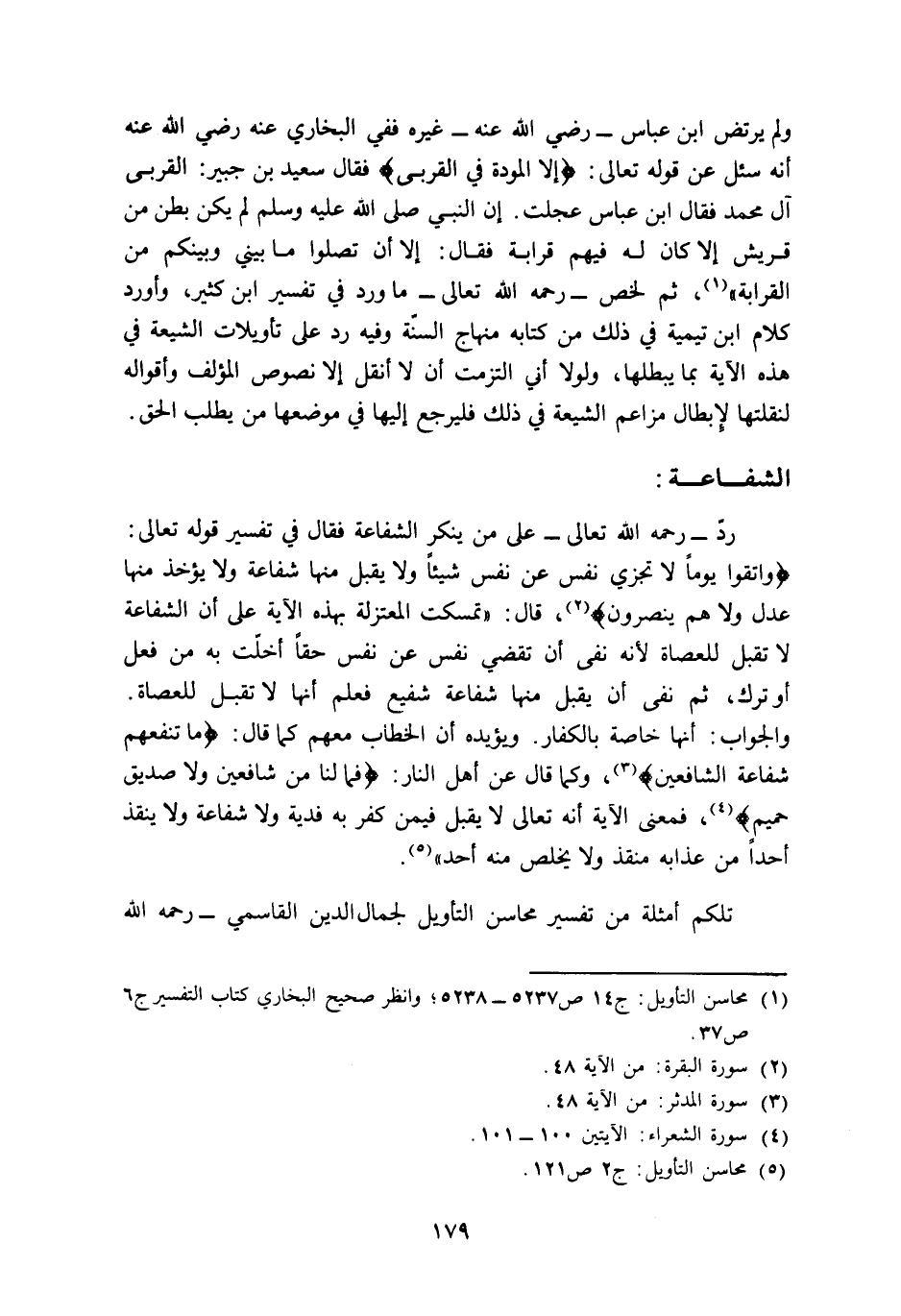 ولم يرتض ابن عباس -رضي الله عنه- غيره, ففي البخاري عنه -رضي الله عنه- أنه سئل عن قوله تعالى: {إِلَّا الْمَوَدَّةَ فِي الْقُرْبَى} فقال سعيد بن جبير: {الْقُرْبَى} آل محمد فقال ابن عباس: عجلت, إن النبي صلى الله عليه وسلم لم يكن بطن من قريش إلا كان له فيهم قرابة فقال: "إلا أن تصلوا ما بيني وبينكم من القرابة" 1، ثم لخص -رحمه الله تعالى- ما ورد في تفسير ابن كثير، وأورد كلام ابن تيمية في ذلك من كتابه: منهاج السنة, وفيه رد على تأويلات الشيعة في هذه الآية بما يبطلها، ولولا أني التزمت أن لا أنقل إلا نصوص المؤلف وأقواله لنقلتها لإبطال مزاعم الشيعة في ذلك فليرجع إليها في موضعها من يطلب الحق.