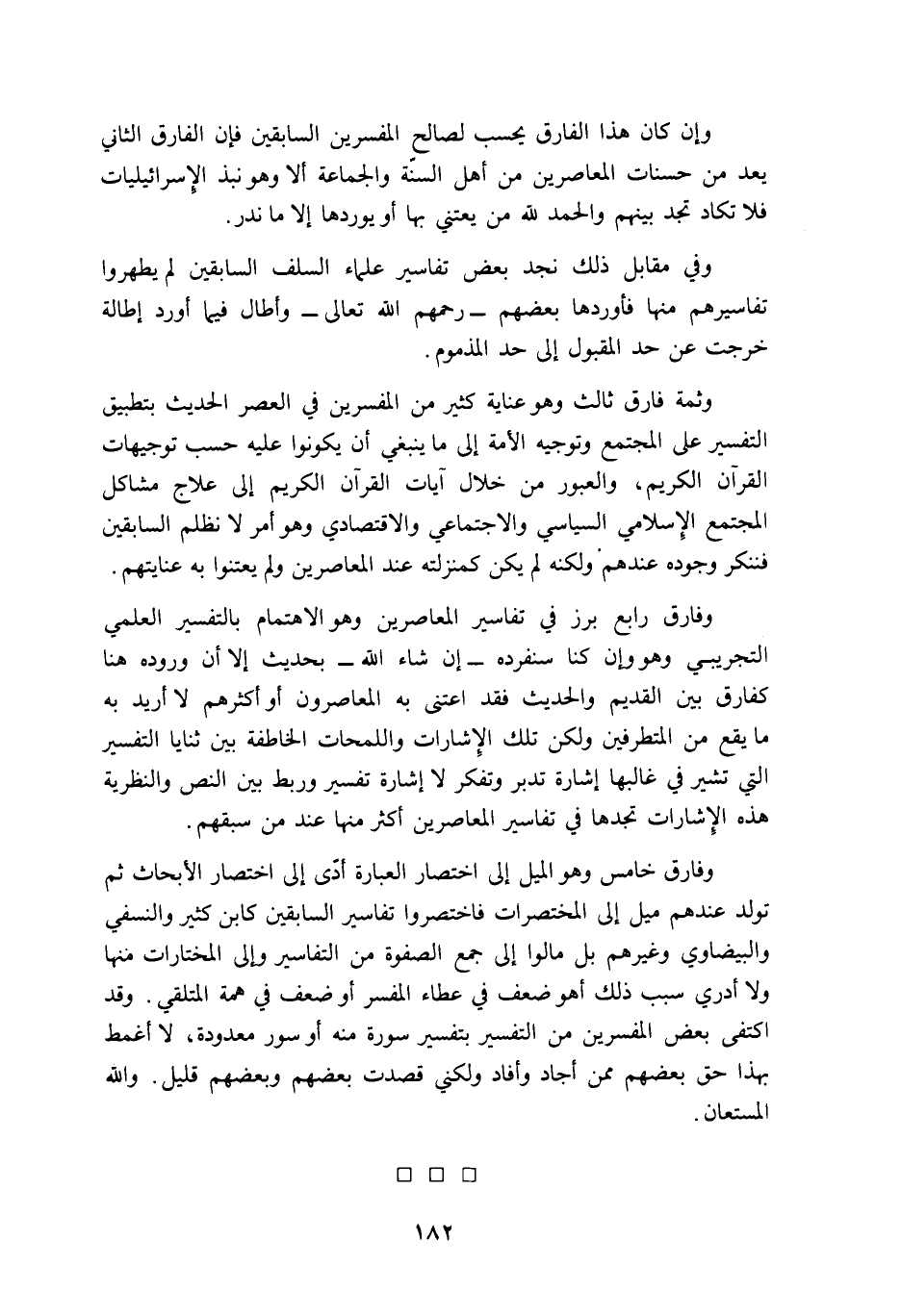 وفارق خامس وهو الميل إلى اختصار العبارة أدى إلى اختصار الأبحاث ثم تولد عندهم ميل إلى المختصرات فاختصروا تفاسير السابقين كابن كثير والنسفي والبيضاوى وغيرهم, بل مالوا إلى جمع الصفوة من التفاسير وإلى المختارات منها ولا أدري سبب ذلك: أهو ضعف في عطاء المفسر أو ضعف في همة المتلقي. وقد اكتفى بعض المفسرين من التفسير بتفسير سورة منه أو سور معدودة، لا أغمط بهذا حق بعضهم ممن أجاد وأفاد, ولكني قصدت بعضهم وبعضهم قليل, والله المستعان.