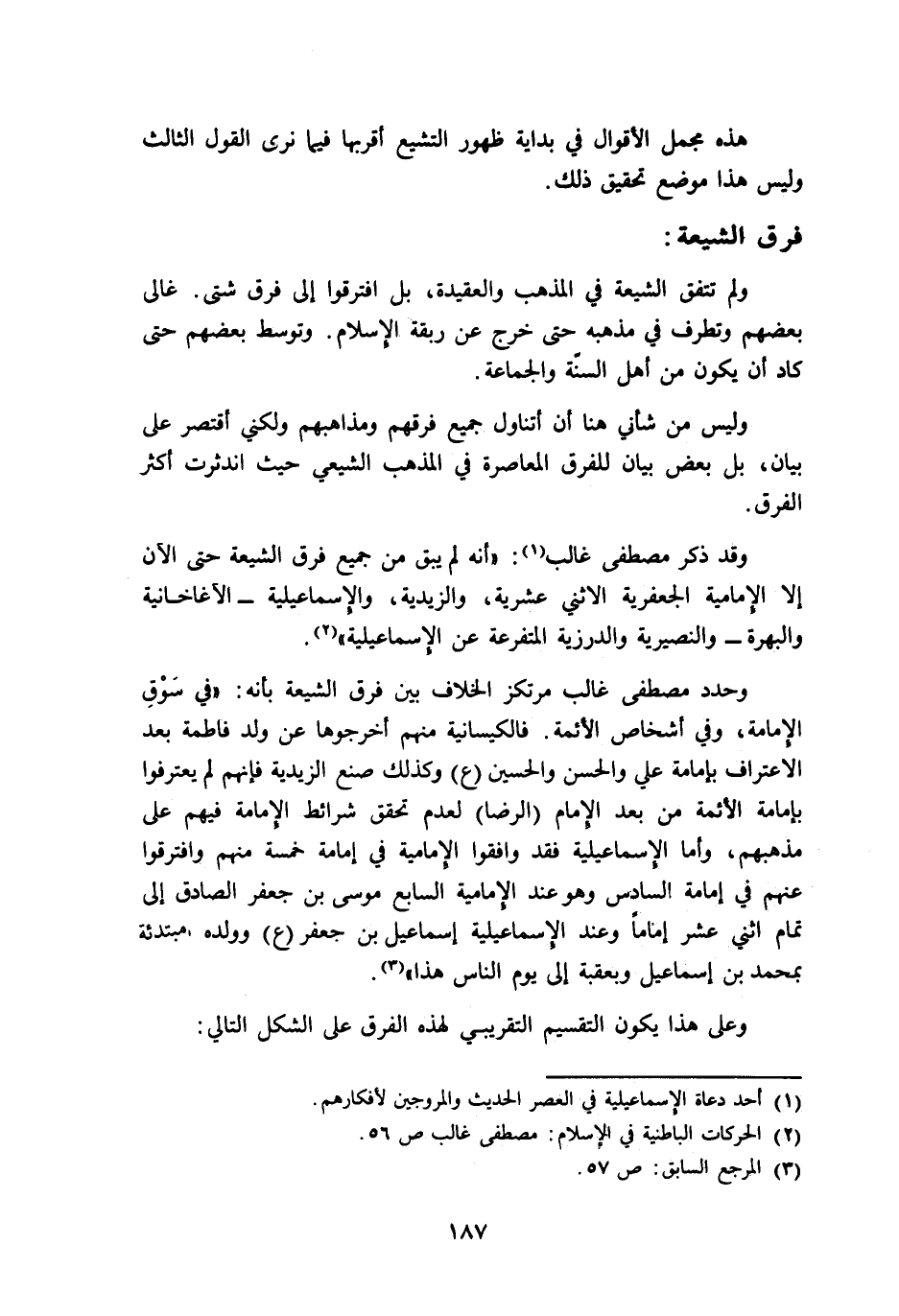 وقد ذكر مصطفى غالب1: "أنه لم يبق من جميع فرق الشيعة حتى الآن إلا الإمامية الجعفرية الاثنا عشرية، والزيدية، والإسماعيلية -الآغاخانية والبهرة- والنصيرية والدرزية المتفرعة عن الإسماعيلية"2.