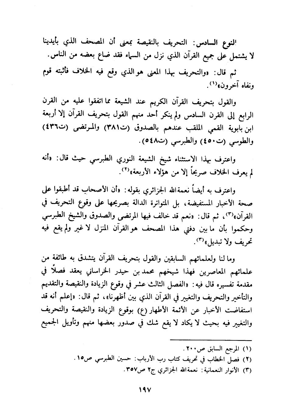 واعترف به أيضا نعمة الله الجزائري بقوله: "إن الأصحاب قد أطبقوا على صحة الأخبار المستفيضة، بل المتواترة الدالة بصريحها على وقوع التحريف في القرآن"3، ثم قال: "نعم قد خالف فيه المرتضى والصدوق والشيخ الطبرسي, وحكموا بأن ما بين دفتي هذا المصحف هو القرآن المنزل لا غير, ولم يقع فيه تحريف ولا تبديل"3.