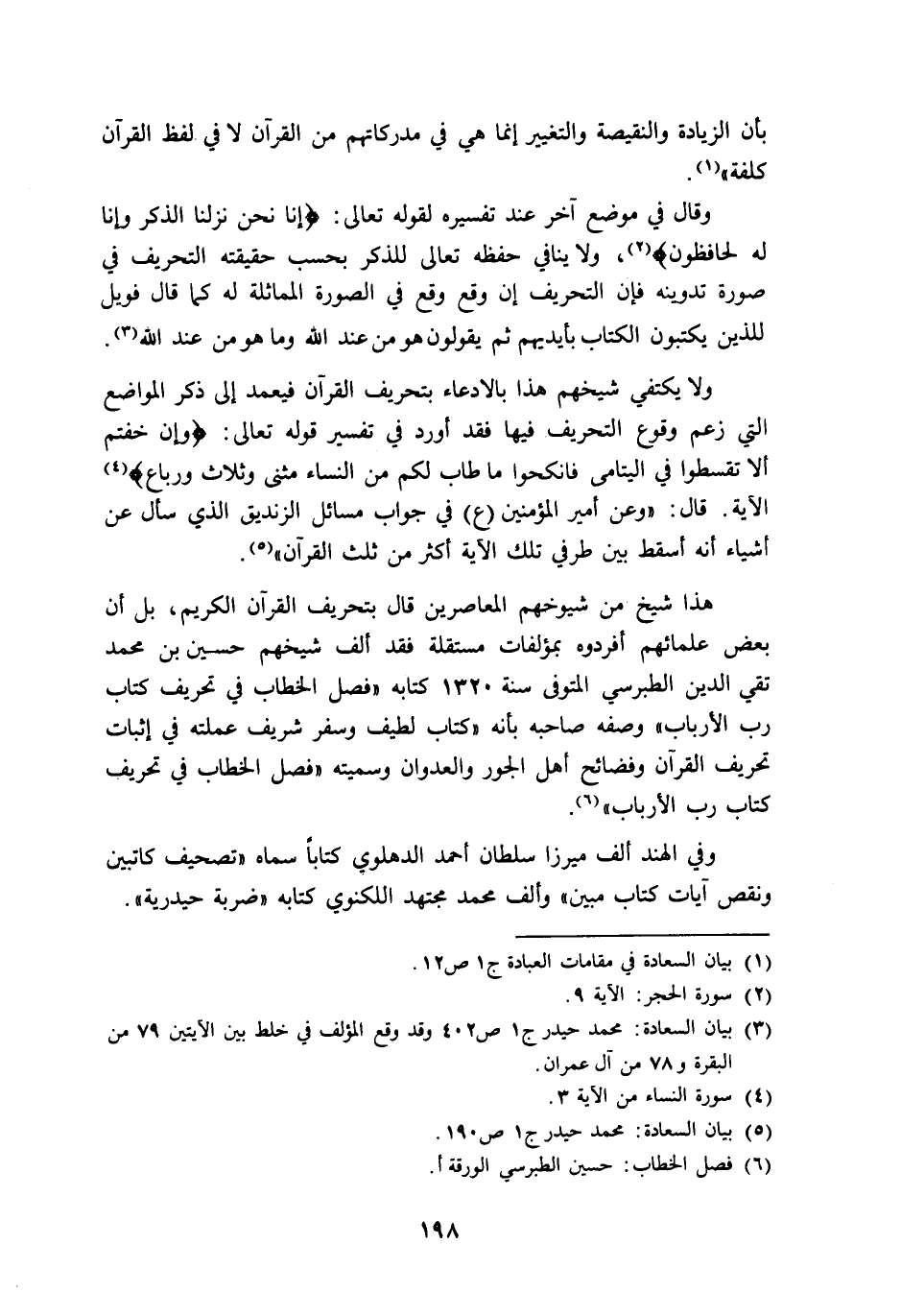 هذا شيخ من شيوخهم المعاصرين قال بتحريف القرآن الكريم، بل إن بعض علمائهم أفردوه بمؤلفات مستقلة, فقد ألف شيخهم حسين بن محمد تقي الدين الطبرسي المتوفى سنة 1320 كتابه: "فصل الخطاب في تحريف كتاب رب الأرباب" وصفه صاحبه بأنه "كتاب لطيف وسفر شريف عملته في إثبات تحريف القرآن وفضائح أهل الجور والعدوان, وسميته: "فصل الخطاب في تحريف كتاب رب الأرباب""6.