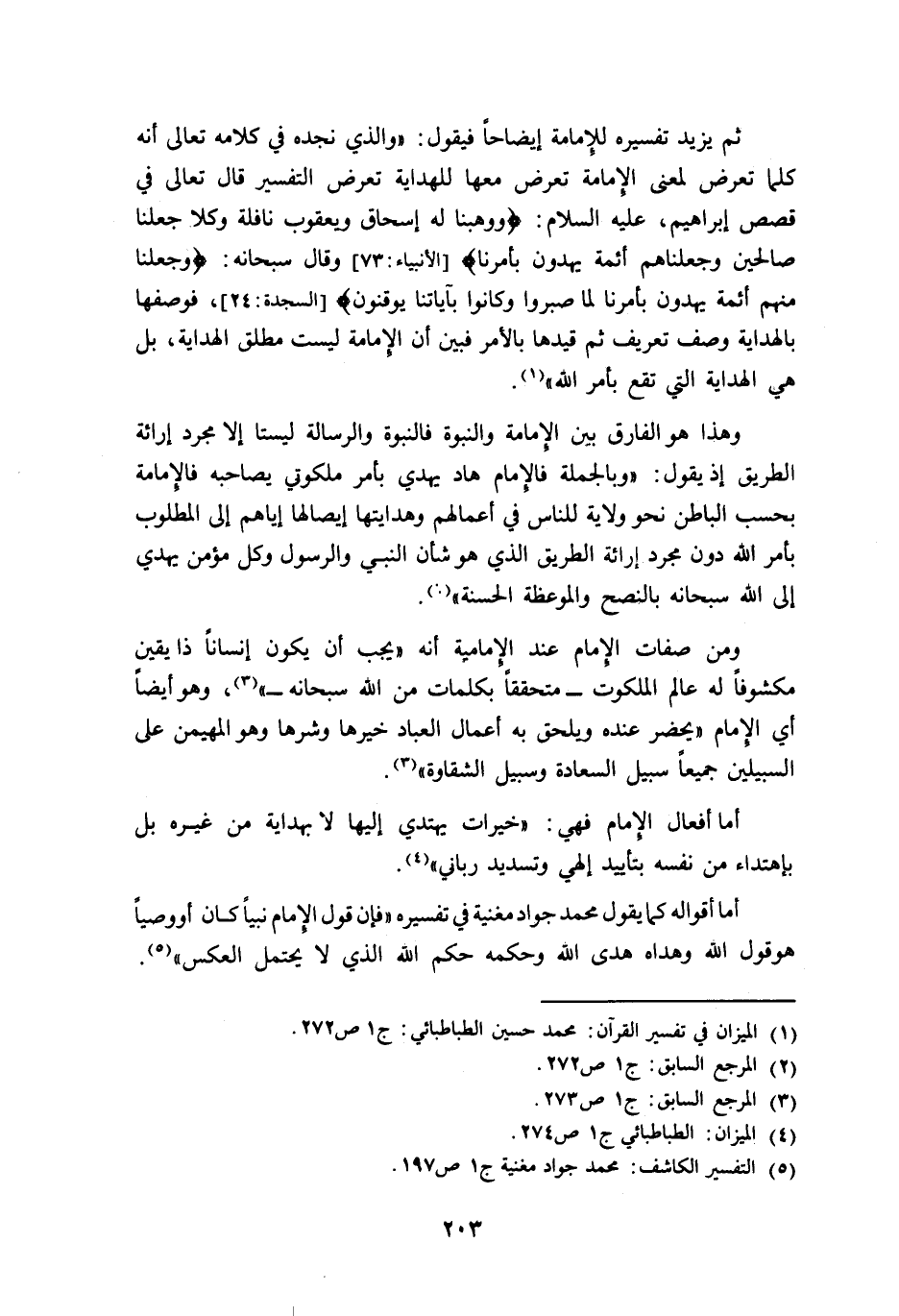 ثم يزيد تفسيره للإمامة إيضاحا فيقول: "والذي نجده في كلامه تعالى أنه كلما تعرض لمعنى الإمامة تعرض معها للهداية تعرض التفسير, قال تعالى في قصص إبراهيم -عليه السلام: {وَوَهَبْنَا لَهُ إِسْحَاقَ وَيَعْقُوبَ نَافِلَةً وَكُلًّا جَعَلْنَا صَالِحِينَ، وَجَعَلْنَاهُمْ أَئِمَّةً يَهْدُونَ بِأَمْرِنَا} [الأنبياء: 73] وقال سبحانه: {وَجَعَلْنَا مِنْهُمْ أَئِمَّةً يَهْدُونَ بِأَمْرِنَا لَمَّا صَبَرُوا وَكَانُوا بِآياتِنَا يُوقِنُونَ} [السجدة: 24] ، فوصفها بالهداية وصف تعريف ثم قيدها بالأمر فبين أن الإمامة ليست مطلق الهداية، بل هي الهداية التي تقع بأمرالله"1.