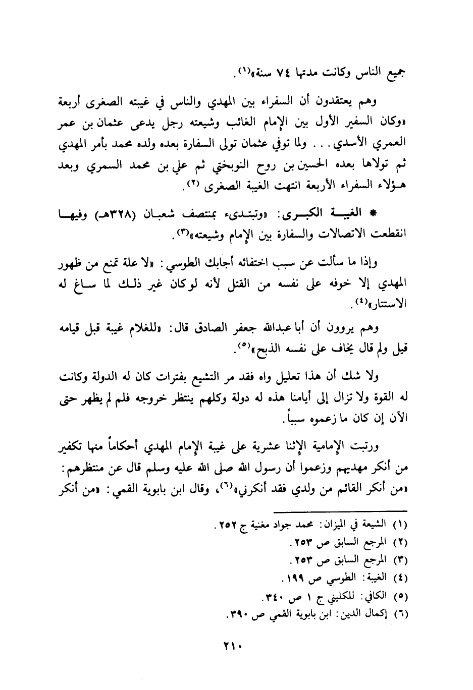 الغيبة الكبرى: "وتبتدئ بمنتصف شعبان "328هـ" وفيها انقطعت الاتصالات والسفارة بين الإمام وشيعته"3.