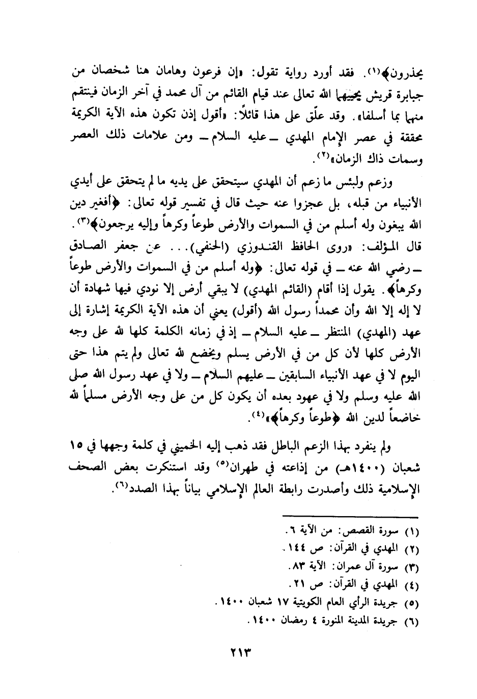 وزعم -ولبئس ما زعم- أن المهدي سيتحقق على يديه ما لم يتحقق على أيدي الأنبياء من قبله، بل عجزوا عنه حيث قال في تفسير قوله تعالى: {أَفَغَيْرَ دِينِ اللَّهِ يَبْغُونَ وَلَهُ أَسْلَمَ مَنْ فِي السَّمَاوَاتِ وَالْأَرْضِ طَوْعًا وَكَرْهًا وَإِلَيْهِ يُرْجَعُونَ} 3. قال المؤلف: "روى الحافظ القندوزي "الحنفي" ... عن جعفر الصادق -رضي الله عنه- في قوله تعالى: {وَلَهُ أَسْلَمَ مَنْ فِي السَّمَاوَاتِ وَالْأَرْضِ طَوْعًا وَكَرْهًا وَإِلَيْهِ يُرْجَعُونَ} يقول: إذا أقام "القائم المهدي" لا يبقى أرض إلا نودي فيها شهادة أن لا إله إلا الله وأن محمدا رسول الله "أقول" يعني أن هذه الآية الكريمة إشارة إلى عهد "المهدي" المنتظر -عليه السلام- إذ في زمانه الكلمة كلها لله على وجه الأرض كلها؛ لأن كل من في الأرض يسلم ويخضع لله تعالى ولم يتم هذا حتى اليوم لا في عهد الأنبياء السابقين -عليهم السلام- ولا في عهد رسول الله -صلى الله عليه وسلم- ولا في عهود بعده أن يكون كل من على وجه الأرض مسلما لله خاضعا لدين الله {طَوْعًا وَكَرْهًا} 4.