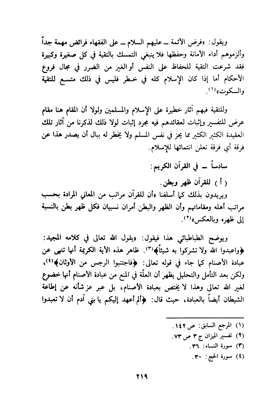 ويوضح الطباطبائي هذا فيقول: "يقول الله تعالى في كلامه المجيد: {وَاعْبُدُوا اللَّهَ وَلا تُشْرِكُوا بِهِ شَيْئًا} 2 ظاهر هذه الآية الكريمة أنها تنهى عن عبادة الأصنام كما جاء في قوله تعالى: {فَاجْتَنِبُوا الرِّجْسَ مِنَ الْأَوْثَانِ} 3، ولكن بعد التأمل والتحليل يظهر أن العلة في المنع من عبادة الأصنام أنها خضوع لغير الله تعالى وهذا لا يختص بعبادة الأصنام، بل عبر عز شأنه عن إطاعة الشيطان أيضا بالعبادة، حيث قال: {أَلَمْ أَعْهَدْ إِلَيْكُمْ يَا بَنِي آدَمَ أَنْ لا تَعْبُدُوا