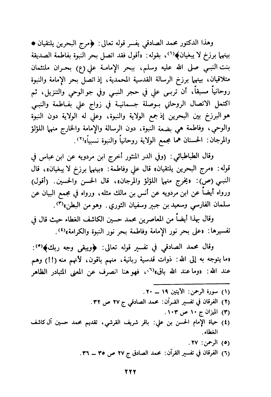 وهذا الدكتور محمد الصادقي يفسر قوله تعالى: {مَرَجَ الْبَحْرَيْنِ يَلْتَقِيَانِ، بَيْنَهُمَا بَرْزَخٌ لا يَبْغِيَانِ} 1، بقوله: "أقول: فقد اتصل بحر النبوة بفاطمة الصديقة بنت النبي صلى الله عليه وسلم ببحر الإمامة علي "ع", بحران ملتئمان متلاقيان، بينهما برزخ الرسالة القدسية المحمدية، إذ اتصل بحر الإمامة والنبوة روحانيا مسبقا، أن تربى علي في حجر النبي وفي جو الوحي والتنزيل، ثم اكتمل الاتصال الروحاني بوصلة جسمانية في زواج علي بفاطمة والنبي هو البرزخ بين البحرين إذ جمع الولاية والنبوة، وعلي له الولاية دون النبوة والوحي، وفاطمة هي بضع النبوة، دون الرسالة والإمامة والخارج منهما اللؤلؤ والمرجان: الحسنان هما مجمع الولاية روحانيا والنبوة نسبيا"2.
