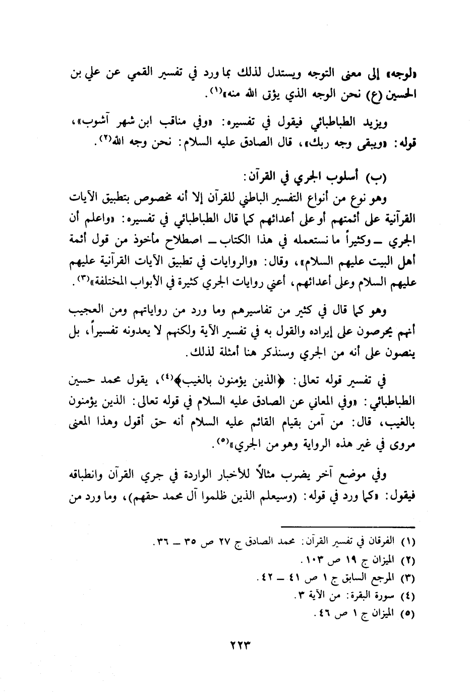 ويزيد الطباطبائي فيقول في تفسيره: "وفي مناقب ابن شهر آشوب"، قوله: {وَيَبْقَى وَجْهُ رَبِّكَ} قال الصادق عليه السلام: نحن وجه الله2.