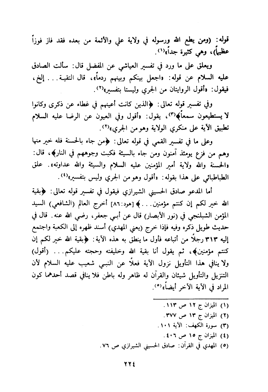 أما المدعو صادق الحسيني الشيرازي فيقول في تفسير قوله تعالى: {بَقِيَّتُ اللَّهِ خَيْرٌ لَكُمْ إِنْ كُنْتُمْ مُؤْمِنِينَ} [هود: 86] : أخرج العالم "الشافعي" السيد المؤمن الشبلنجي في "نور الأبصار" قال عن أبي جعفر، رضي الله عنه, قال في حديث طويل ذكره وفيه: "فإذا خرج "يعني المهدي" أسند ظهره إلى الكعبة واجتمع إليه 313 رجلا من أتباعه, فأول ما ينطق به هذه الآية: {بَقِيَّتُ اللَّهِ خَيْرٌ لَكُمْ إِنْ كُنْتُمْ مُؤْمِنِينَ} ، ثم يقول: أنا بقية الله وخليفته وحجته عليكم". "أقول": ولا ينافي هذا التأويل نزول الآية فعلا عن النبي شعيب عليه السلام؛ لأن التنزيل والتأويل شيئان والقرآن له ظاهر وله باطن فلا ينافي قصد أحدهما كون المراد في الآية الآخر أيضا"5.