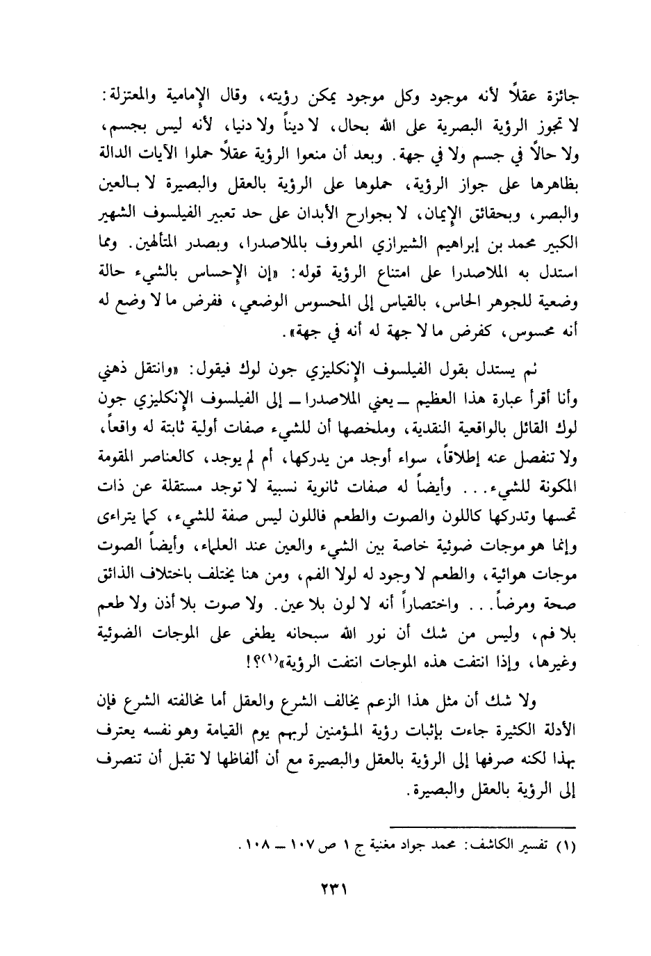 ثم يستدل بقول الفيلسوف الإنجليزي جون لوك فيقول: "وانتقل ذهني وأنا أقرأ عبارة هذا العظيم -يعني الملا صدرا- إلى الفيلسوف الإنجليزي جون لوك القائل بالواقعية النقدية، وملخصها أن للشيء صفات أولية ثابتة له واقعا، ولا تنفصل عنه إطلاقا، سواء أوجد من يدركها أم لم يوجد، كالعناصر المقومة المكونة للشيء ... وأيضا له صفات ثانوية نسبية لا توجد مستقلة عن ذات تحسها وتدركها كاللون والصوت والطعم, فاللون ليس صفة للشيء، كما يتراءى وإنما هو موجات ضوئية خاصة بين الشيء والعين عند العلماء، وأيضا الصوت موجات هوائية، والطعم لا وجود له لولا الفم، ومن هنا يختلف باختلاف الذائق صحة ومرضا ... واختصارا أنه لا لون بلا عين, ولا صوت بلا أذن, ولا طعم بلا فم، وليس من شك أن نور الله سبحانه يطغى على الموجات الضوئية وغيرها، وإذا انتفت هذه الموجات انتفت الرؤية"1؟!