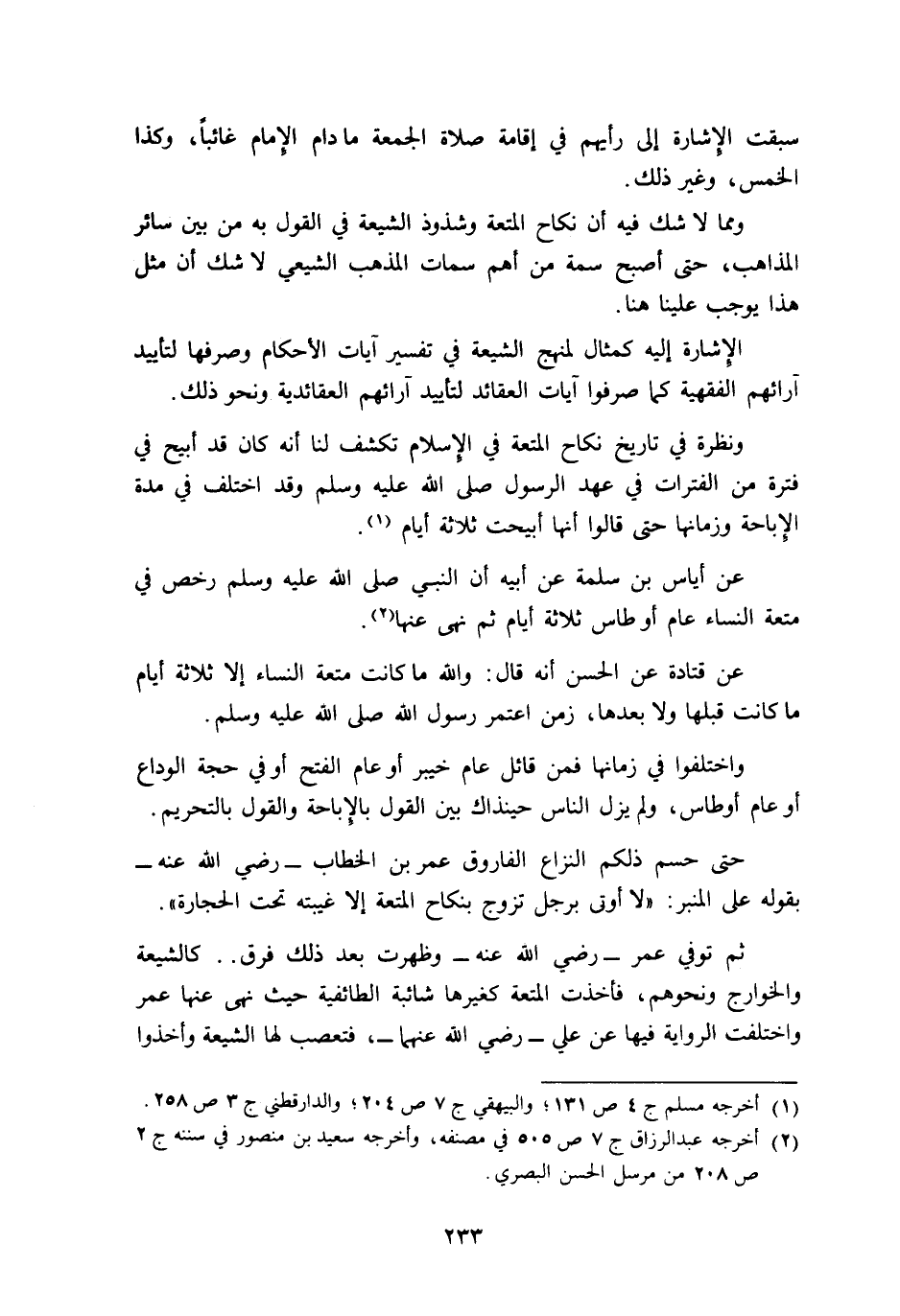 ثم توفي عمر -رضي الله عنه- وظهرت بعد ذلك فرق, كالشيعة والخوارج ونحوهم, فأخذت المتعة كغيرها شائبة الطائفية حيث نهى عنها عمر واختلفت الرواية فيها عن علي -رضي الله عنهما- فتعصب لها الشيعة وأخذوا