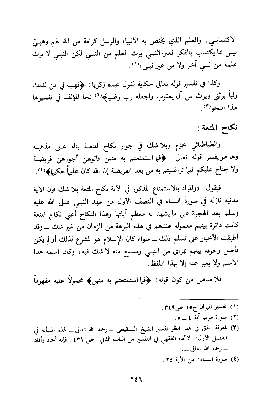 والطباطبائي يجزم وبلا شك في جواز نكاح المتعة بناء على مذهبه, وها هو يفسر قوله تعالى: {فَمَا اسْتَمْتَعْتُمْ بِهِ مِنْهُنَّ فَآتُوهُنَّ أُجُورَهُنَّ فَرِيضَةً وَلا جُنَاحَ عَلَيْكُمْ فِيمَا تَرَاضَيْتُمْ بِهِ مِنْ بَعْدِ الْفَرِيضَةِ إِنَّ اللَّهَ كَانَ عَلِيمًا حَكِيمًا} 4.