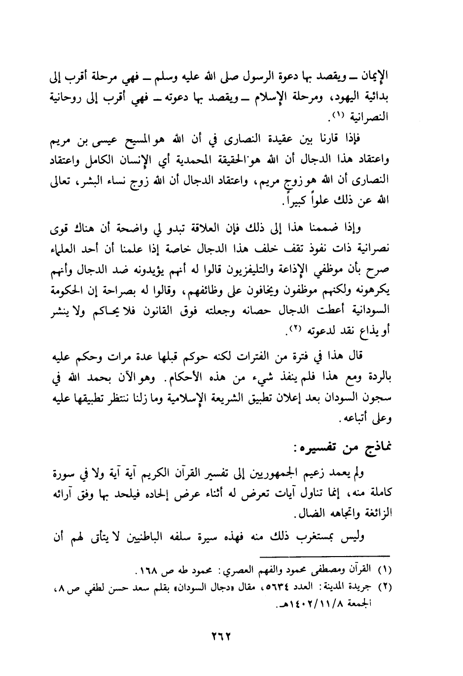 قال هذا في فترة من الفترات, لكنه حُوكم قبلها عدة مرات وحكم عليه بالردة ومع هذا فلم ينفذ شيء من هذه الأحكام. وهو الآن بحمد الله في سجون السودان بعد إعلان تطبيق الشريعة الإسلامية وما زلنا ننتظر تطبيقها عليه وعلى أتباعه.