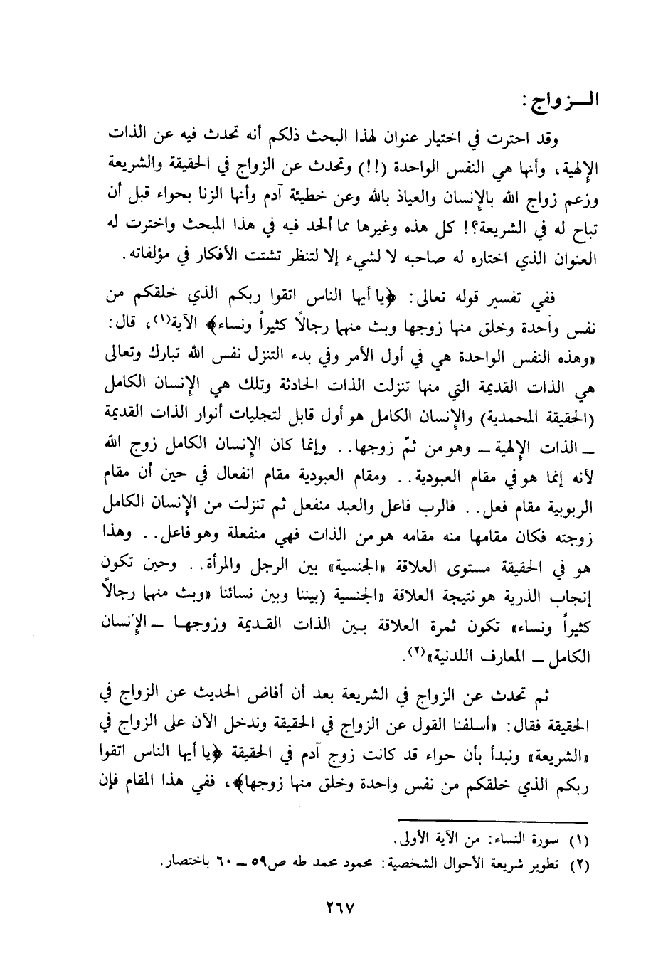 ثم تحدث عن الزواج في الشريعة بعد أن أفاض الحديث عن الزواج في الحقيقة فقال: "أسلفنا القول عن الزواج في الحقيقة, وندخل الآن على الزواج في "الشريعة" ونبدأ بأن حواء قد كانت زوج آدم في الحقيقة: {يَا أَيُّهَا النَّاسُ اتَّقُوا رَبَّكُمُ الَّذِي خَلَقَكُمْ مِنْ نَفْسٍ وَاحِدَةٍ وَخَلَقَ مِنْهَا زَوْجَهَا} ، ففي هذا المقام فإن