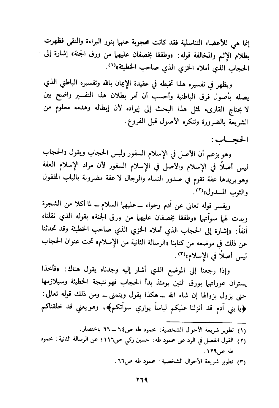 وإذا رجعنا إلى الموضع الذي أشار إليه وجدناه يقول هناك: "فأخذا يستران عوراتهما بورق التين يومئذ بدأ الحجاب, فهو نتيجة الخطيئة وسيلازمها حتى يزول بزوالها إن شاء الله -هكذا يقول ويتمنى- ومن ذلك قوله تعالى: {يَا بَنِي آدَمَ قَدْ أَنْزَلْنَا عَلَيْكُمْ لِبَاسًا يُوَارِي سَوْآتِكُمْ} ، وهو يعني قد خلقناكم