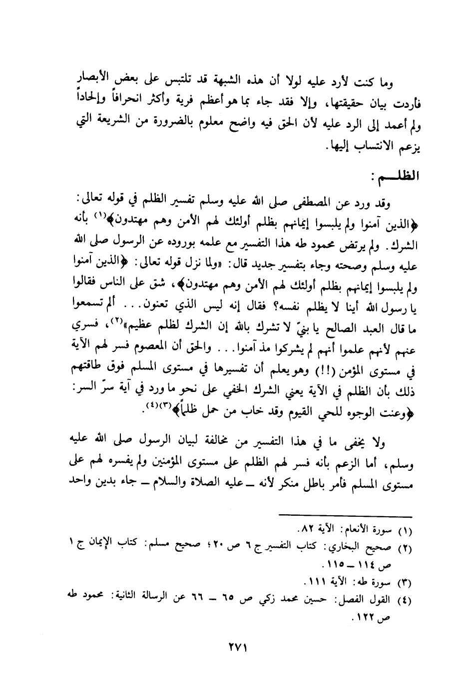 وقد ورد عن المصطفى -صلى الله عليه وسلم- تفسير الظلم في قوله تعالى: {الَّذِينَ آمَنُوا وَلَمْ يَلْبِسُوا إِيمَانَهُمْ بِظُلْمٍ أُولَئِكَ لَهُمُ الْأَمْنُ وَهُمْ مُهْتَدُونَ} 1 بأنه الشرك. ولم يرتض محمود طه هذا التفسير مع علمه بوروده عن الرسول -صلى الله عليه وسلم- وصحته, وجاء بتفسير جديد قال: "ولما نزل قوله تعالى: {الَّذِينَ آمَنُوا وَلَمْ يَلْبِسُوا إِيمَانَهُمْ بِظُلْمٍ أُولَئِكَ لَهُمُ الْأَمْنُ وَهُمْ مُهْتَدُونَ} ، شق على الناس فقالوا: يا رسول الله أينا لا يظلم نفسه؟ فقال: "إنه ليس الذي تعنون ... ألم تسمعوا ما قال العبد الصالح: يا بنيّ لا تشرك بالله, إن الشرك لظلم عظيم""2، فسري عنهم لأنهم علموا أنهم لم يشركوا مذ آمنوا ... والحق أن المعصوم فسر لهم الآية في مستوى المؤمن"!! " وهو يعلم أن تفسيرها في مستوى المسلم فوق طاقتهم, ذلك بأن الظلم في الآية يعني الشرك الخفي, على نحو ما ورد في آية سر السر: {وَعَنَتِ الْوُجُوهُ لِلْحَيِّ الْقَيُّومِ وَقَدْ خَابَ مَنْ حَمَلَ ظُلْمًا} 3، 4.