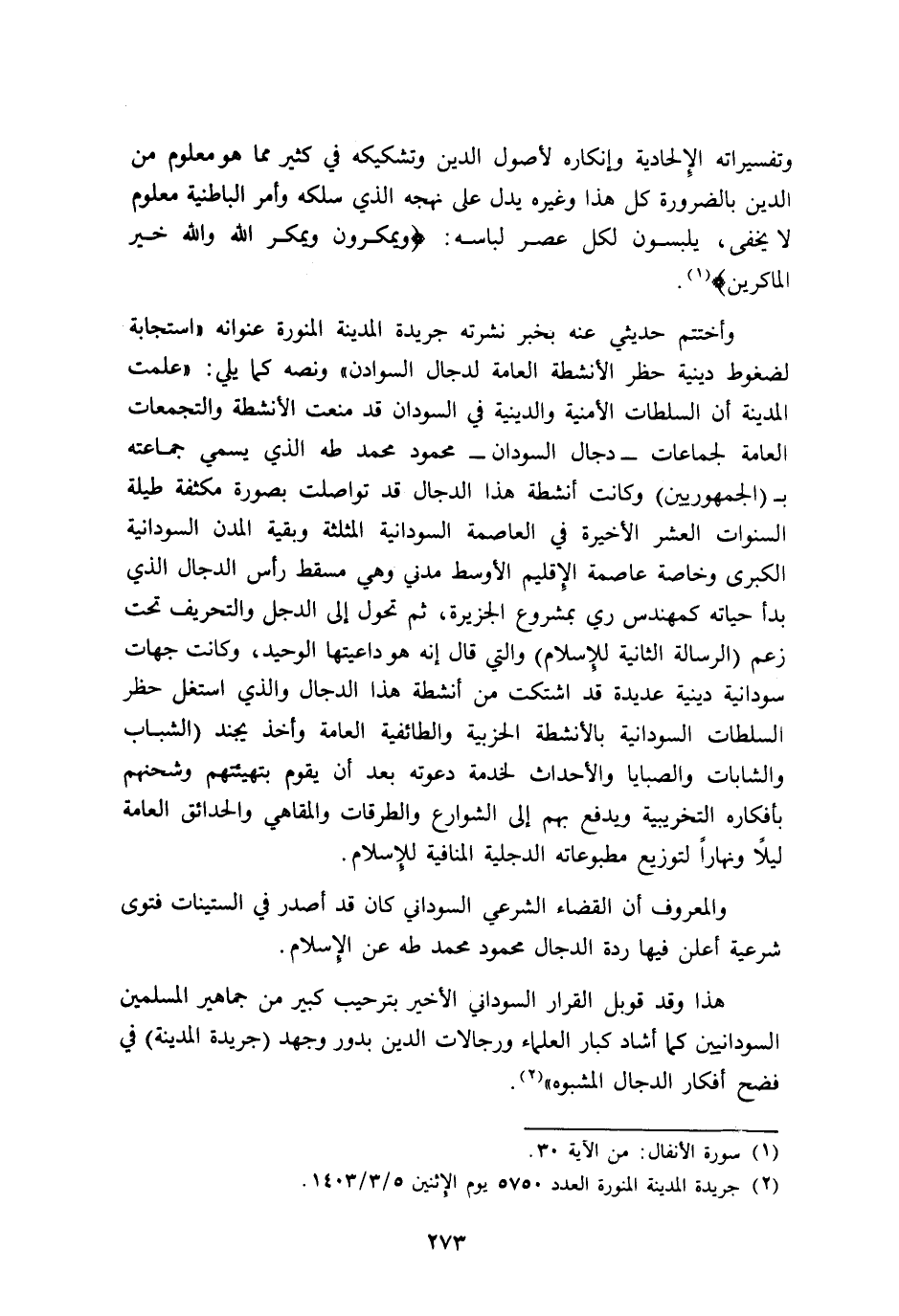 وأختتم حديثي عنه بخبر نشرته جريدة المدينة المنورة عنوانه: "استجابة لضغوط دينية حظر الأنشطة العامة لدجال السودان" ونصه كما يلي: "علمت المدينة أن السلطات الأمنية والدينية في السودان قد منعت الأنشطة والتجمعات العامة لجماعات -دجال السودان- محمود محمد طه الذي يسمي جماعته بـ"الجمهوريين" وكانت أنشطة هذا الدجال قد تواصلت بصورة مكثفة طيلة السنوات العشر الأخيرة في العاصمة السودانية المثلثة وبقية المدن السودانية الكبرى وخاصة عاصمة الإقليم الأوسط "مدني" وهي مسقط رأس الدجال الذي بدأ حياته كمهندس ري بمشروع الجزيرة، ثم تحول إلى الدجل والتحريف تحت زعم "الرسالة الثانية للإسلام" والتي قال: إنه هو داعيتها الوحيد، وكانت جهات سودانية دينية عديدة قد اشتكت من أنشطة هذا الدجال والذي استغل حظر السلطات السودانية بالأنشطة الحزبية والطائفية العامة وأخذ يجند "الشباب والشابات والصبايا والأحداث لخدمة دعوته بعد أن يقوم بتهيئتهم وشحنهم بأفكاره التخريبية ويدفع بهم إلى الشوارع والطرقات والمقاهي والحدائق العامة ليلا ونهارا؛ لتوزيع مطبوعاته الدجلية المنافية للإسلام.