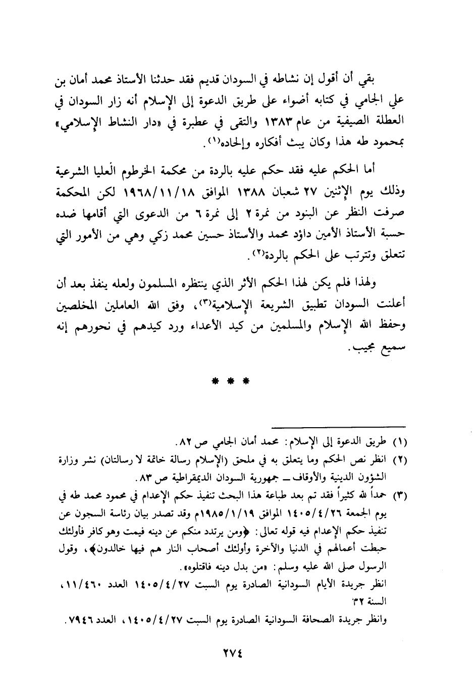 2 انظر نص الحكم وما يتعلق به في ملحق "الإسلام رسالة خاتمة لا رسالتان" نشر وزارة الشئون الدينية والأوقاف, جمهورية السودان الديمقراطية ص83.