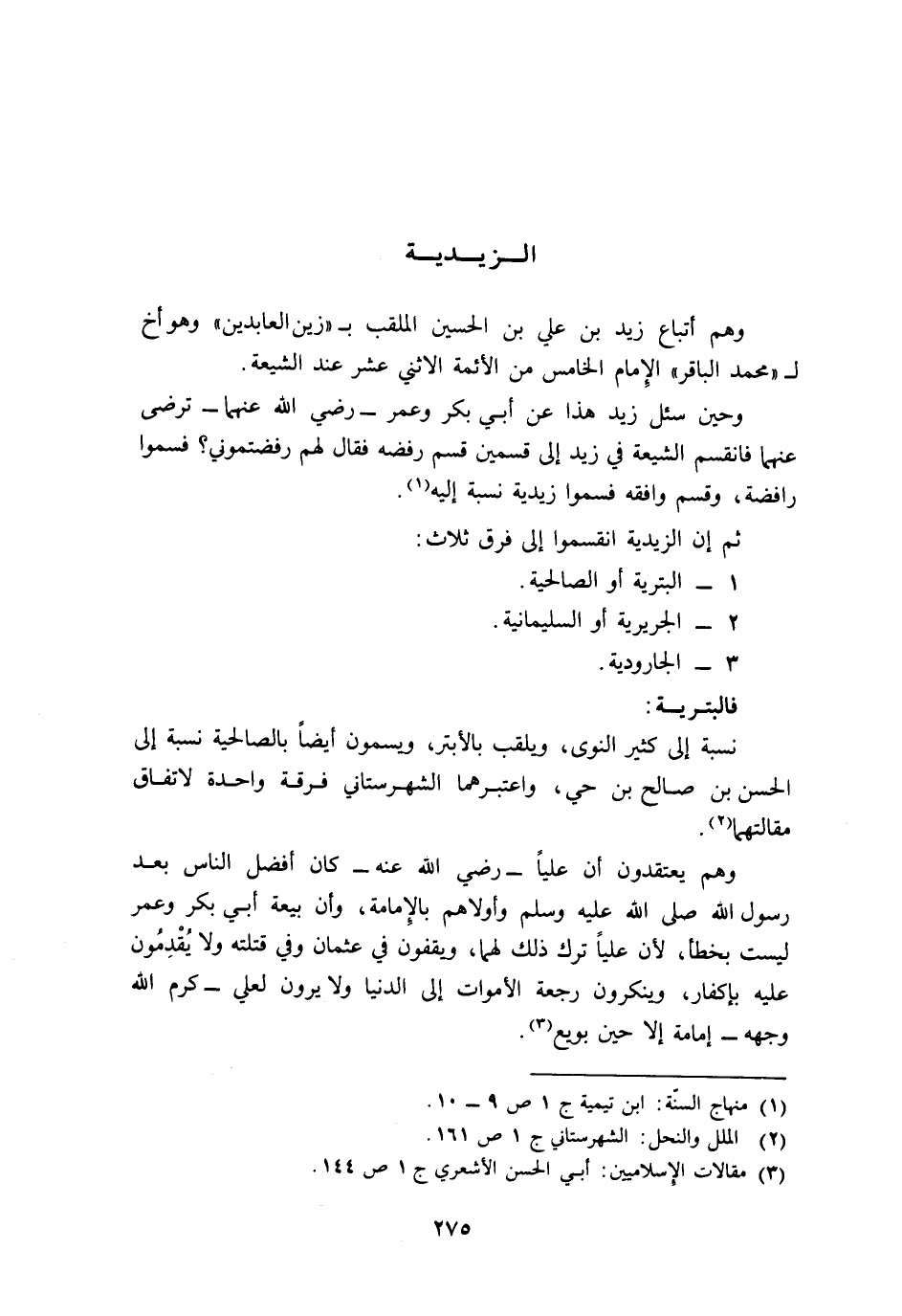 وحين سئل زيد هذا عن أبي بكر وعمر -رضي الله عنهما- ترضى عنهما, فانقسم الشيعة في زيد إلى قسمين: قسم رفضه فقال لهم: رفضتموني؟ فسموا رافضة، وقسم وافقه فسموا زيدية؛ نسبة إليه1.