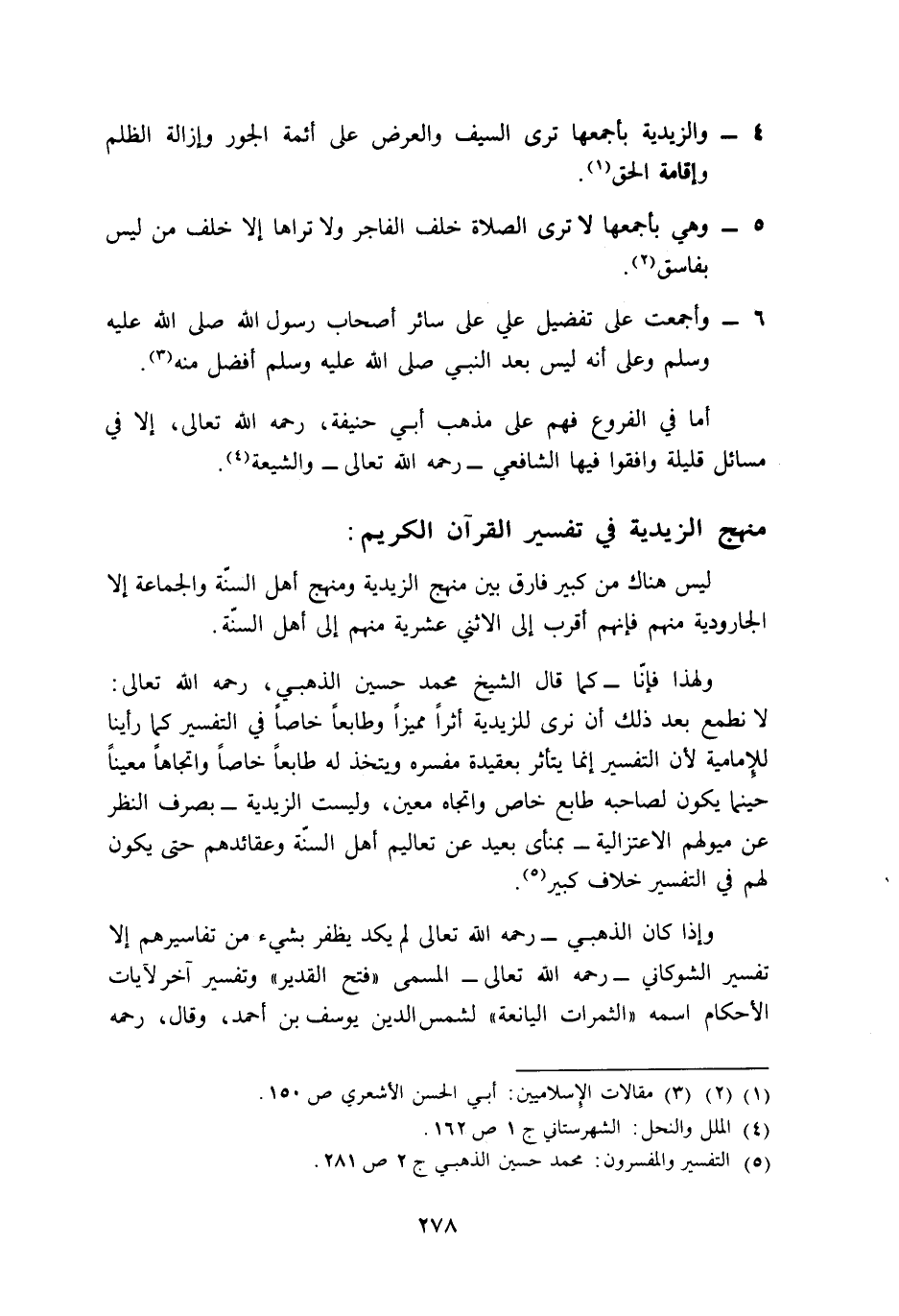 ولهذا فإنا, كما قال الشيخ محمد حسين الذهبي، رحمه الله تعالى: لا نطمع بعد ذلك أن نرى للزيدية أثرا مميزا وطابعا خاصا في التفسير كما رأينا للإمامية؛ لأن التفسير إنما يتأثر بعقيدة مفسرة ويتخذ له طابعا خاصا واتجاها معينا, حينما يكون لصاحبه طابع خاص واتجاه معين, وليست الزيدية -بصرف النظر عن ميولهم الاعتزالية- بمنأى بعيد عن تعاليم أهل السنة وعقائدهم, حتى يكون لهم في التفسير خلاف كبير5.