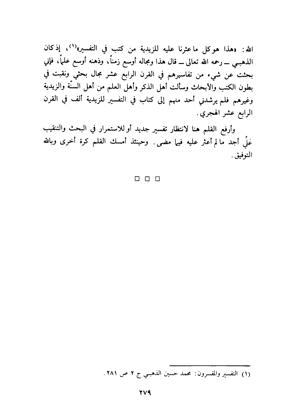 الله: "هذا هو كل ما عثرنا عليه للزيدية من كتب في التفسير"1، إذا كان الذهبي -رحمه الله تعالى- قال هذا ومجاله أوسع زمنا وذهنه أوسع علما، فإني بحثت عن شيء من تفاسيرهم في القرن الرابع عشر مجال بحثي, ونقبت في بطون الكتب والأبحاث وسألت أهل الذكر وأهل العلم من أهل السنة والزيدية وغيرهم, فلم يرشدني أحد منهم إلى كتاب في التفسير للزيدية ألف في القرن الرابع عشر الهجري.