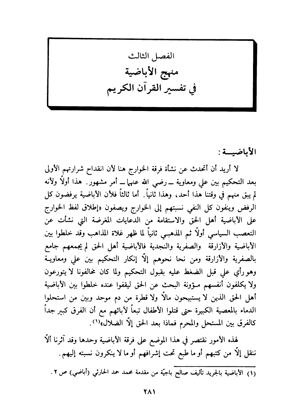 لهذه الأمور نقتصر في هذا الموضع على فرقة الأباضية وحدها, وقد آثرنا ألا ننقل إلا من كتبهم أو ما طبع تحت إشرافهم أو ما لا ينكرون نسبته إليهم.