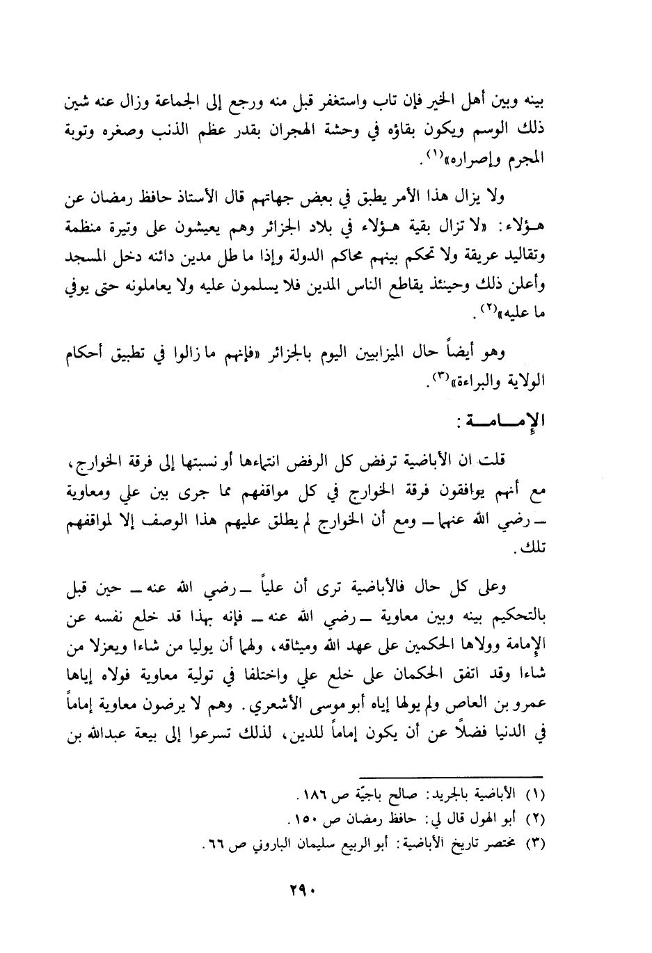 وهو أيضا حال الميزابيين اليوم بالجزائر "فإنهم ما زالوا في تطبيق أحكام الولاية والبراءة"3.