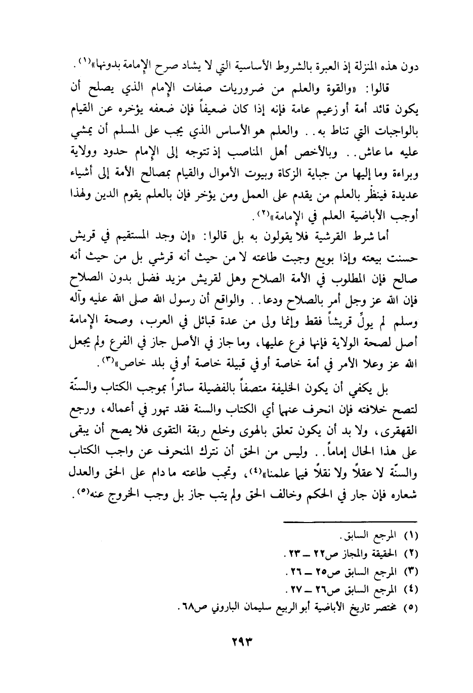 قالوا: "والقوة والعلم من ضروريات صفات الإمام الذي يصلح أن يكون قائد أمة أو زعيم عامة فإنه إذا كان ضعيفا فإن ضعفه يؤخره عن القيام بالواجبات التي تناط به ... والعلم هو الأساس الذي يجب على المسلم أن يمشي عليه ما عاش. وبالأخص أهل المناصب إذ تتوجه إلى الإمام حدود وولاية وبراءة وما إليها من جباية الزكاة وبيوت الأموال والقيام بمصالح الأمة إلى أشياء عديدة, فينظر بالعلم من يقدم على العمل ومن يؤخر, فإن بالعلم يقوم الدين؛ ولهذا أوجب الأباضية العلم في الإمامة"2.
