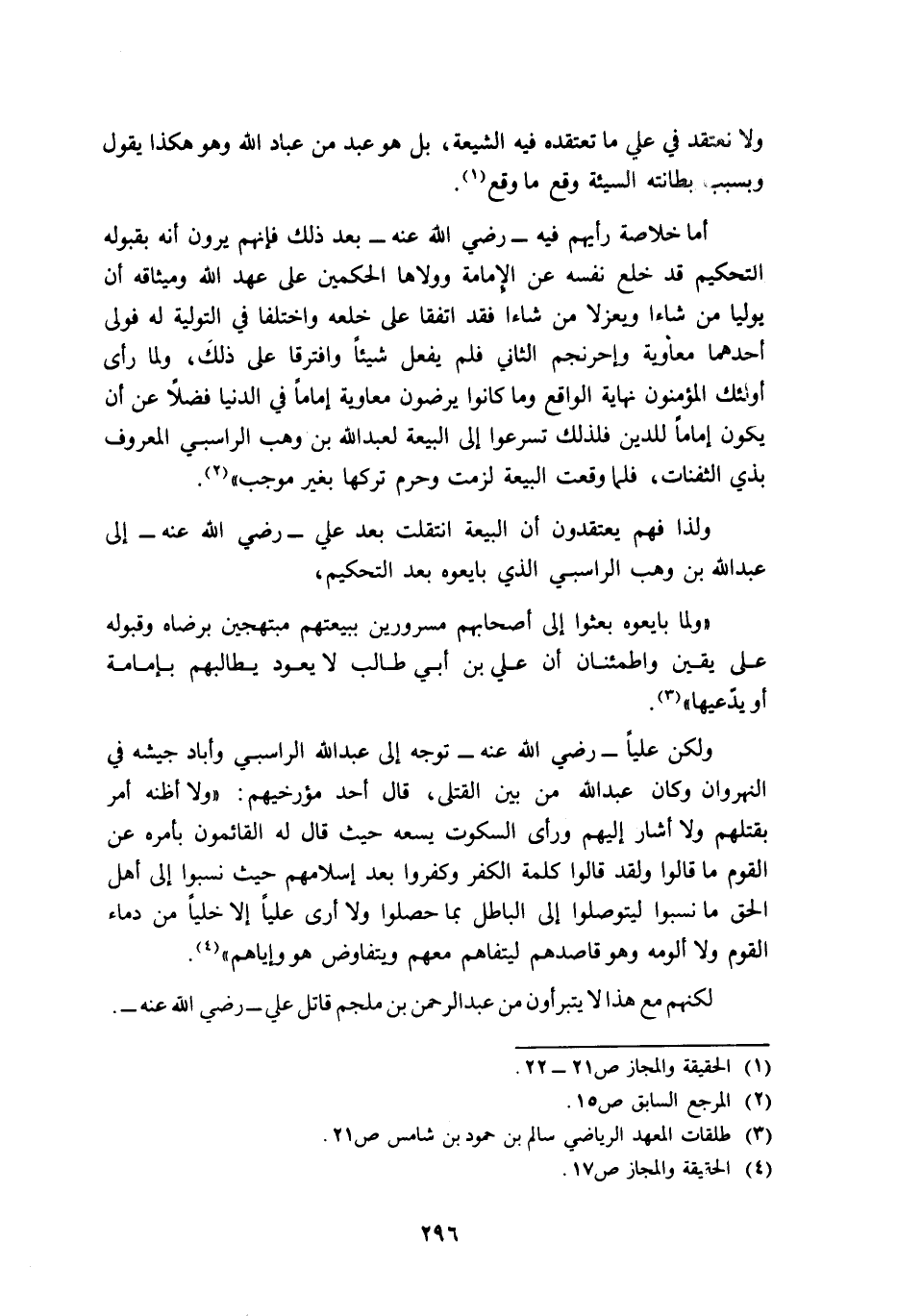 ولا نعتقد في علي ما تعتقده فيه الشيعة، بل هو عبد من عباد الله وهو هكذا يقول, وبسبب بطانته السيئة وقع ما وقع1.